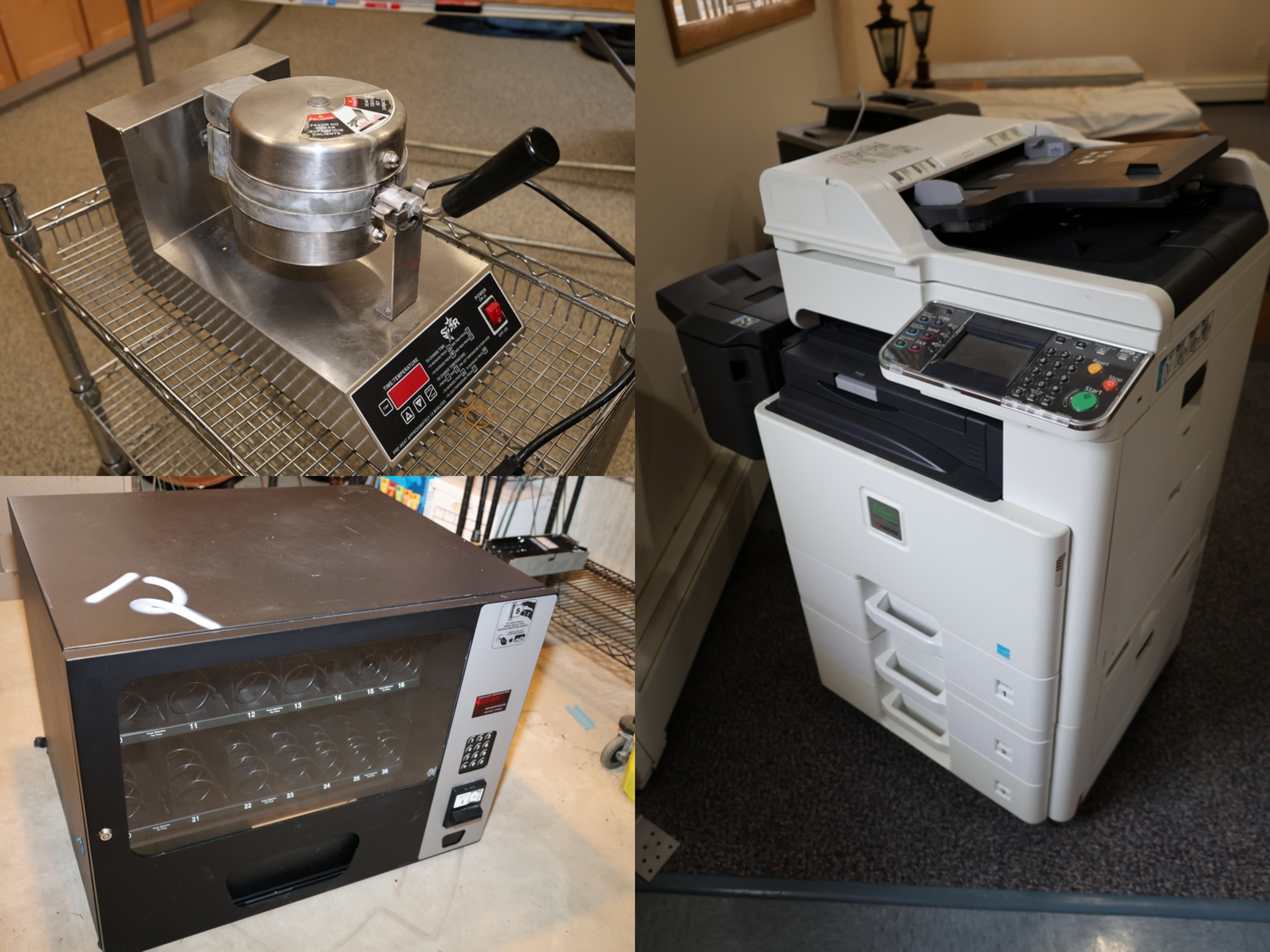 Items include 2002 G.E.M Electric Car: Everett Piano: printers; rubber floor tiles; metal bench with drawers; computer tables & more. Items are located in Turin, NY.