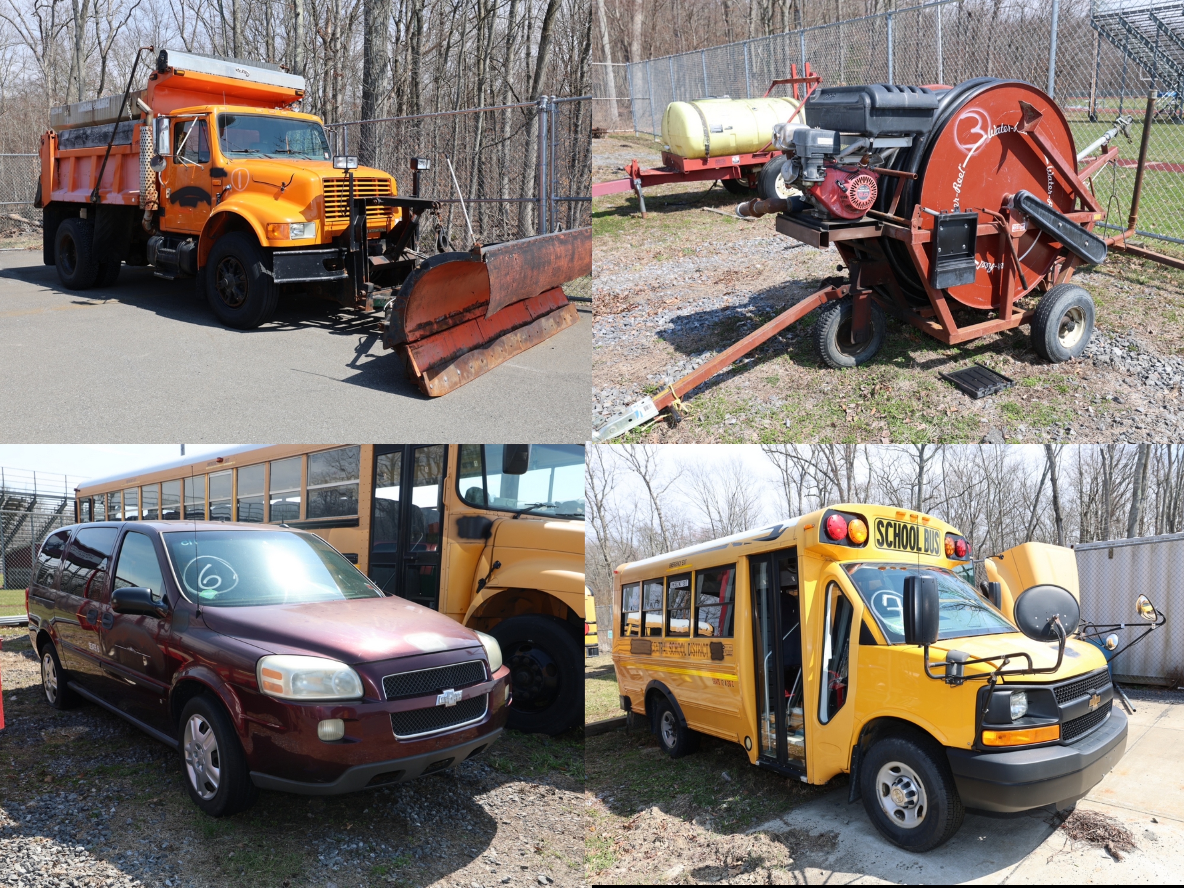 Items include 1992 International 4900 dump truck; 1996 Chevrolet C/K 3500 flatbed; water-reel irrigation; 2008 IC Bus CE Series school bus; 2006 Chevrolet Uplander; Zep steam pressure washer & more...