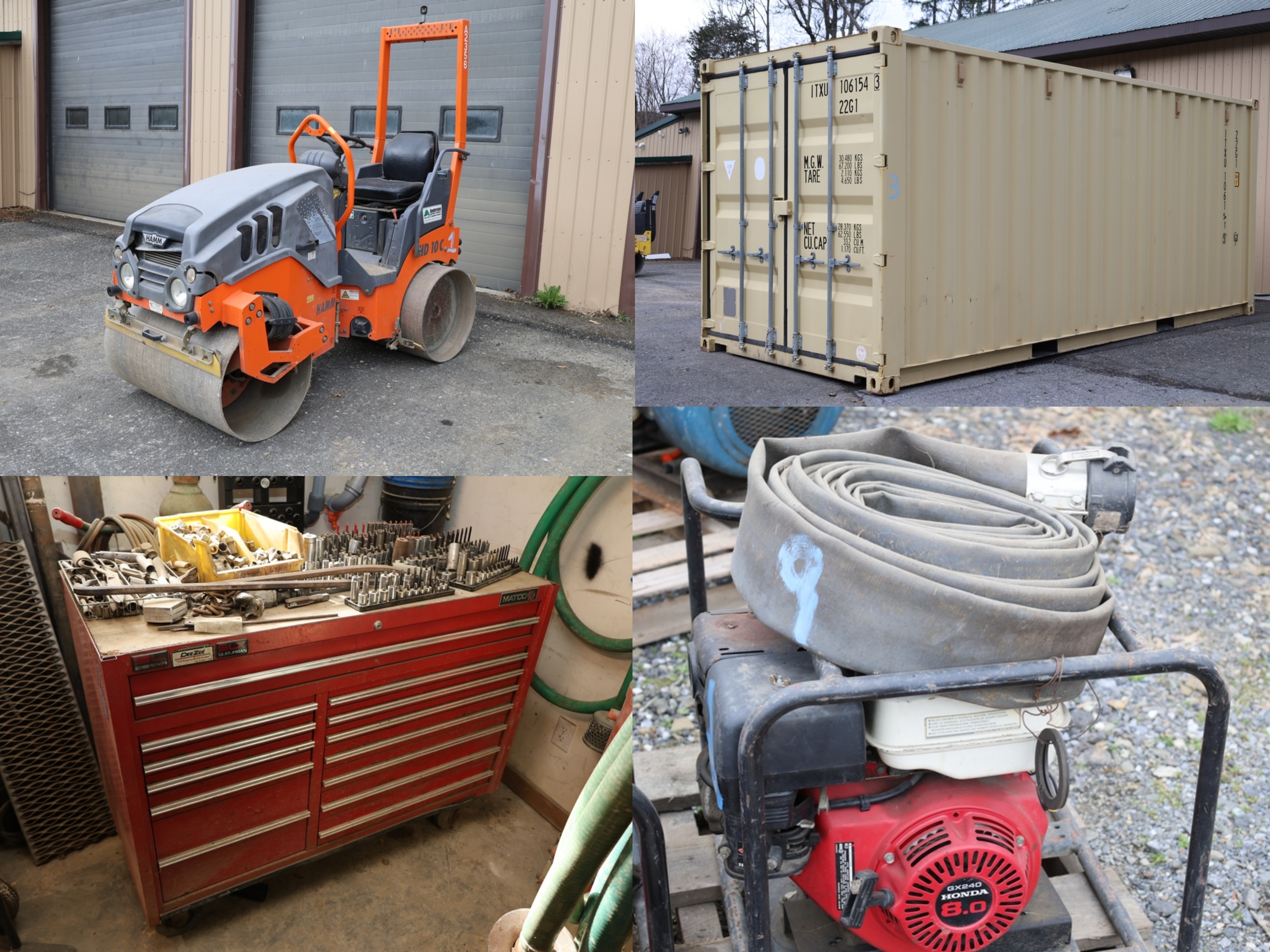 Items include 2013 Hamm HD 10 C tandem roller; 2011 Bomag BW900 50 tandem roller; 2011 Bomag BW900 50 tandem roller; 2005 & 2016 20' shipping containers; 40' shipping container; Matco rolling tool ...