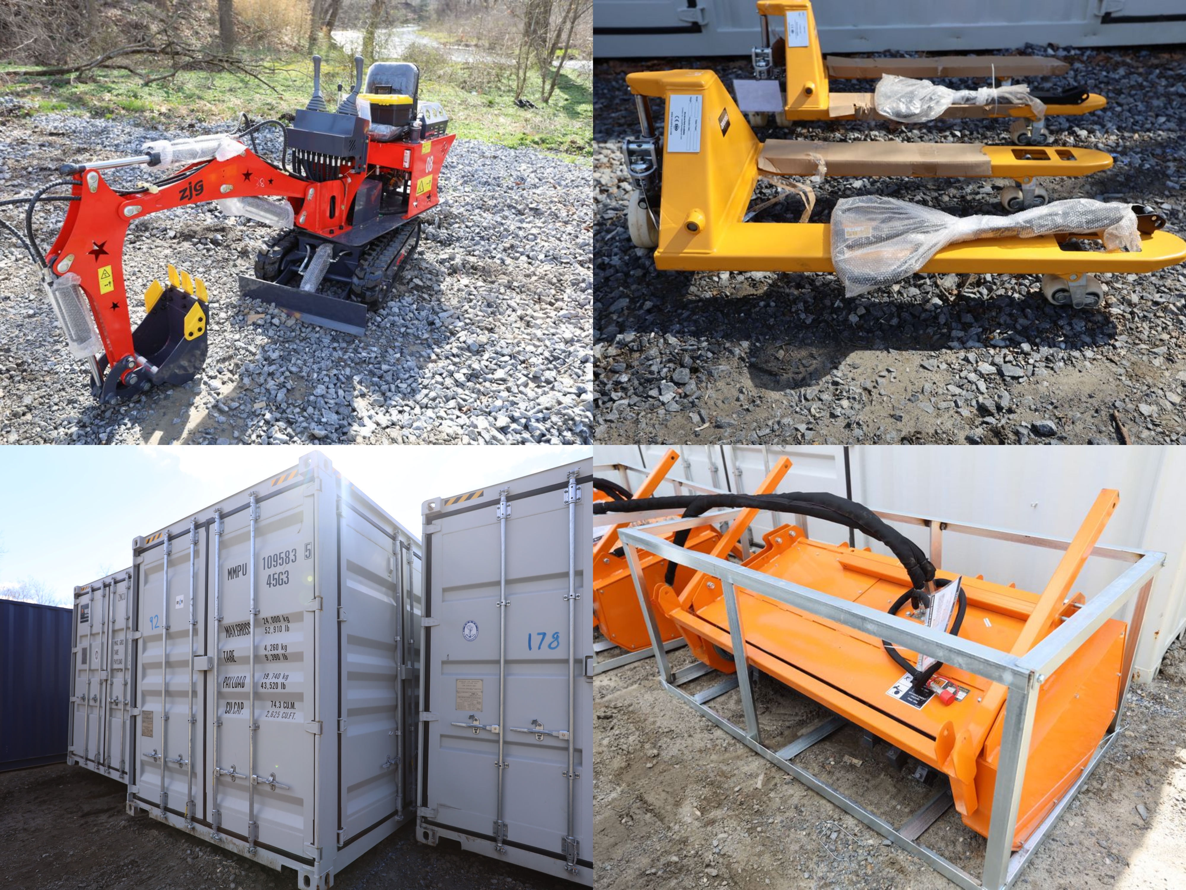 Items include new 2026: ZIG mini skid steer loader, mini excavator 600mm tooth bucket, mini excavator quick connect/wood grabber/rake/ripper tooth; WOLVERINE: mini skid steer stump grinder, rock sc...