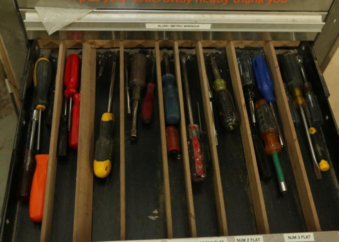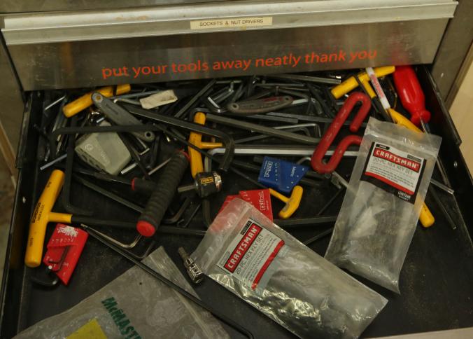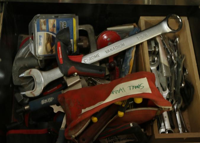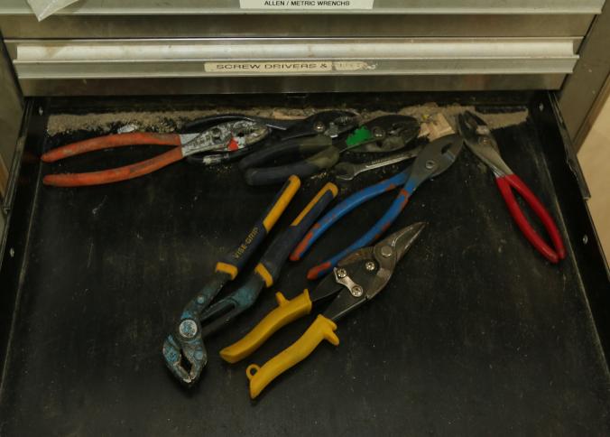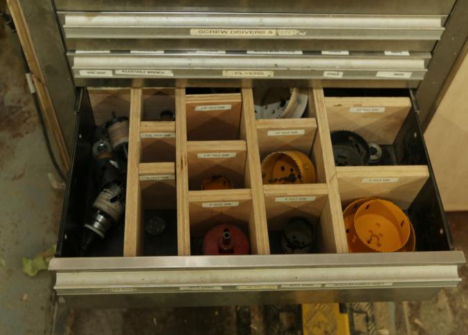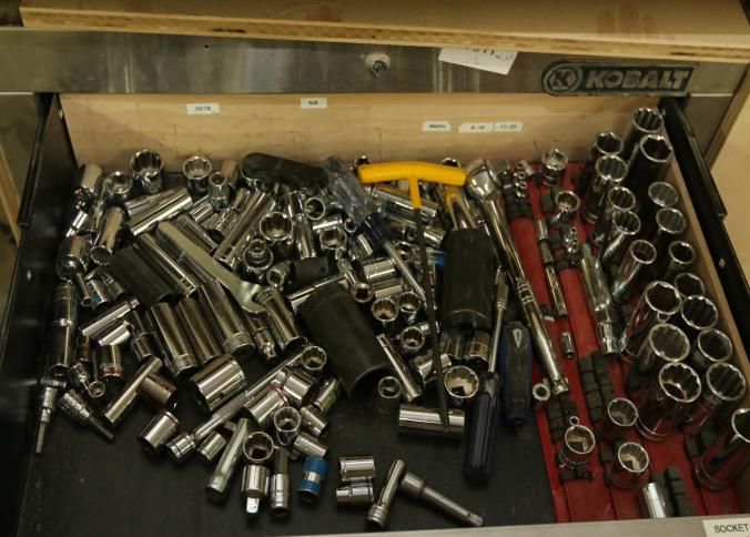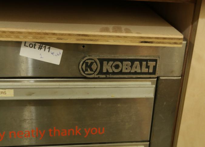 Kobalt tool box and contents including sockets of various sizes and drives, assorted Alan (hex) keys and sockets, hand drivers, pliers, pair of snips, hole saws ranging from .75"-5", clamps hand tools chisels and wrenches. Measures approx 27"x18"x36"t. Pickup must be completed Thursday, September 8 by 3PM.