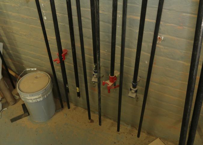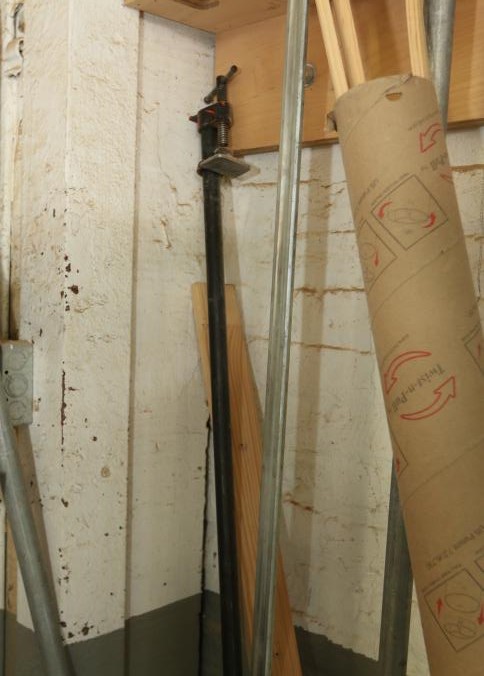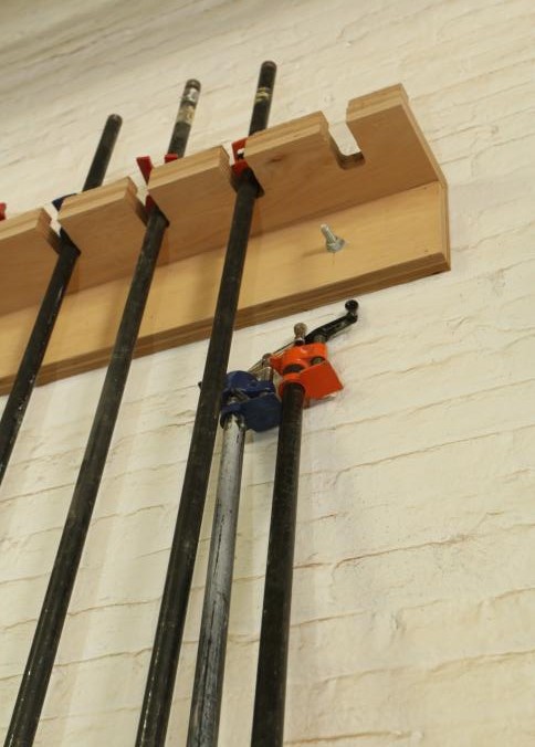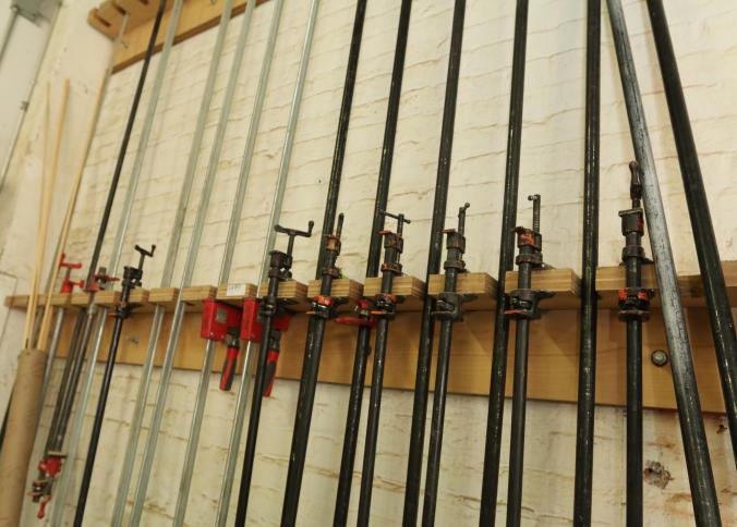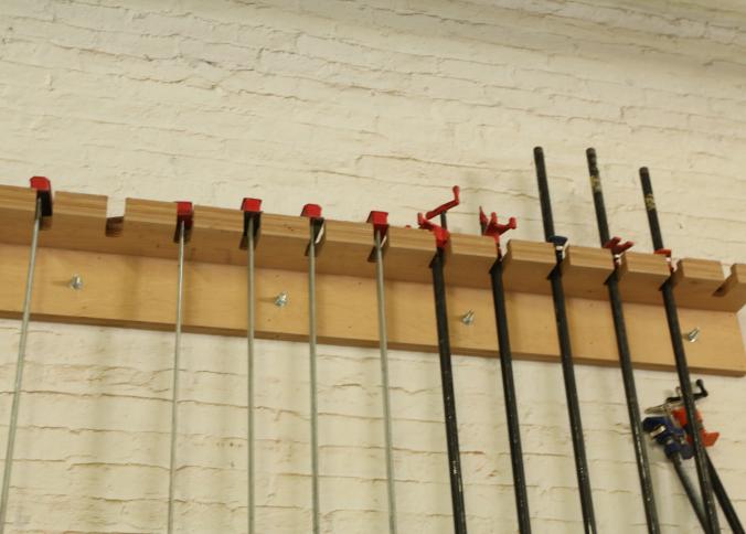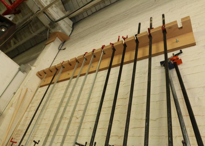 Assorted clamps with the wall storage for the clamps. The largest measuring approx 125" long. Buyer must take all. Pickup can be completed on both days.