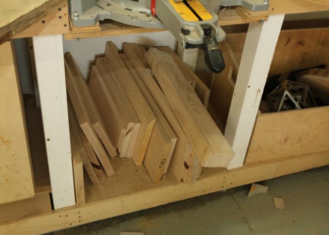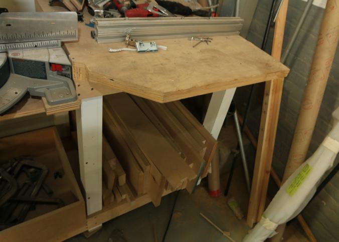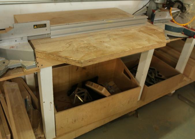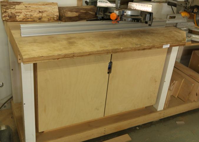 Miter saw table with guides and under top storage compartments. Measures approx 193"x37"x41"t. Excluding contents, band saw parts or miter saws. Pickup must be completed on Friday, September 9 by 3PM.