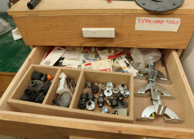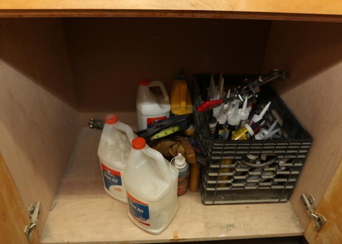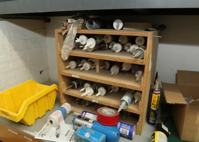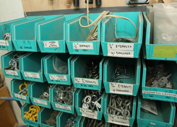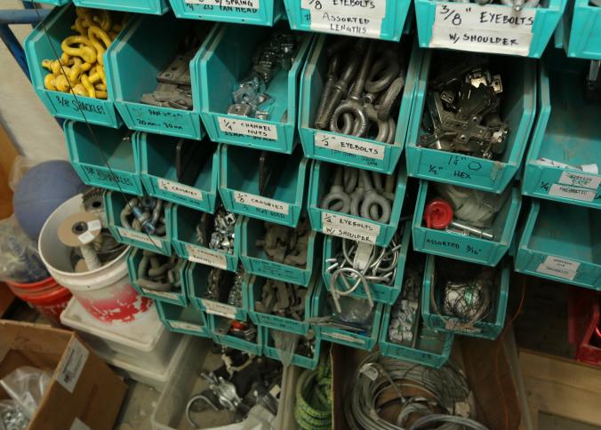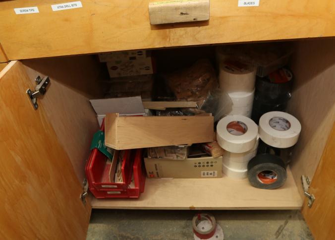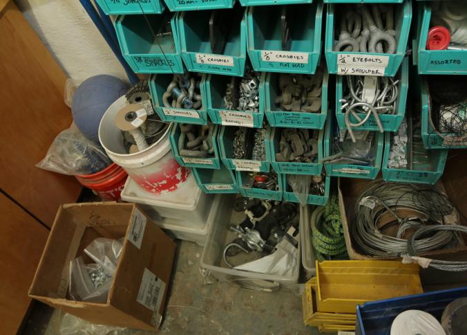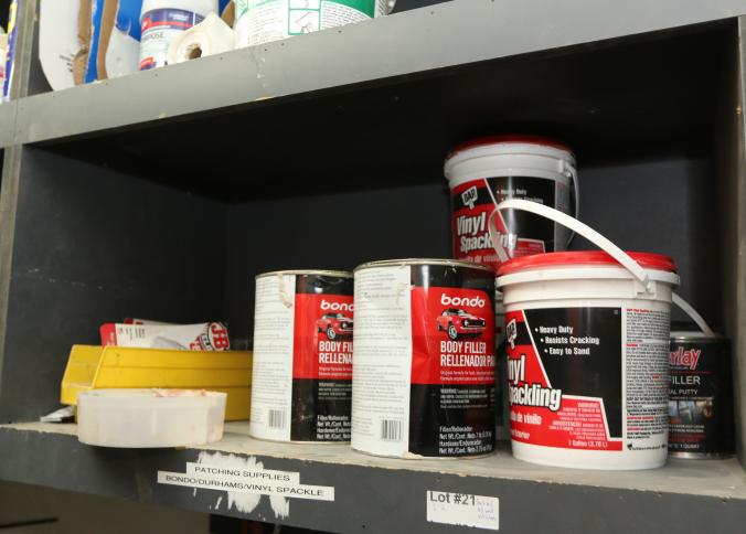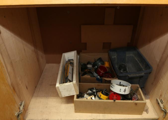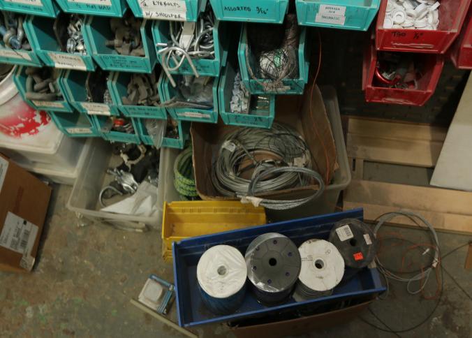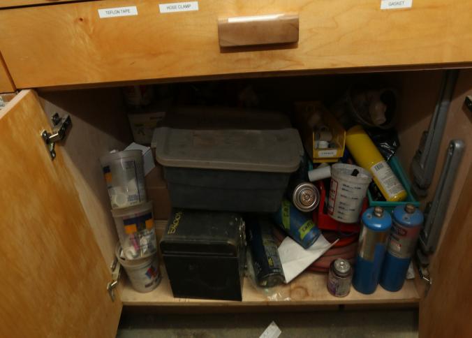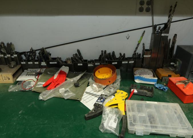 Hardware room right side wall and back wall, all storage mounted on them and contents including Hilti HDM 500 & MD2500 2 part mixing guns, caulk guns, tools, drill bits, speed bore bits, containers, bondo, tanks, hole saw parts, Elmer's glue, caulk, tool storage containers, crimping tools, eye bolts, assembly hardware, cabinet hinges, chain hardware, cable and accessories, U clamps, string, wire, sanding pads, etc. Buyer must take all. Excludes center section and left wall. Pickup can be completed on both days.