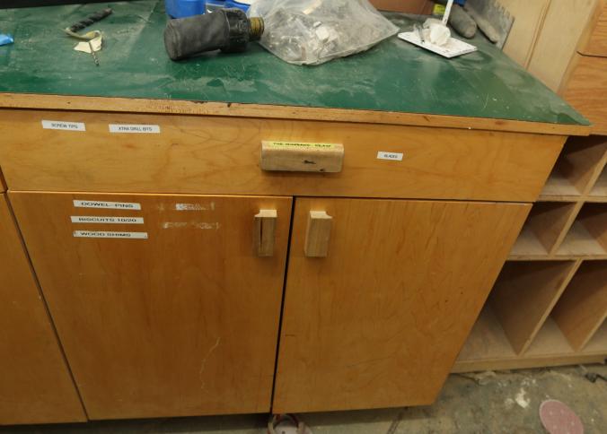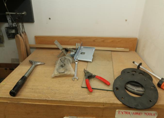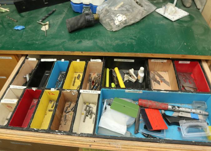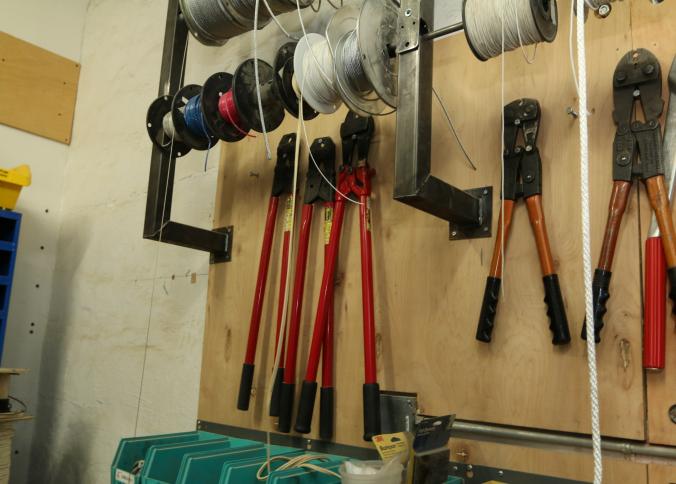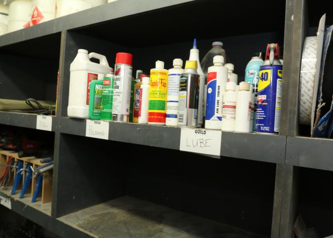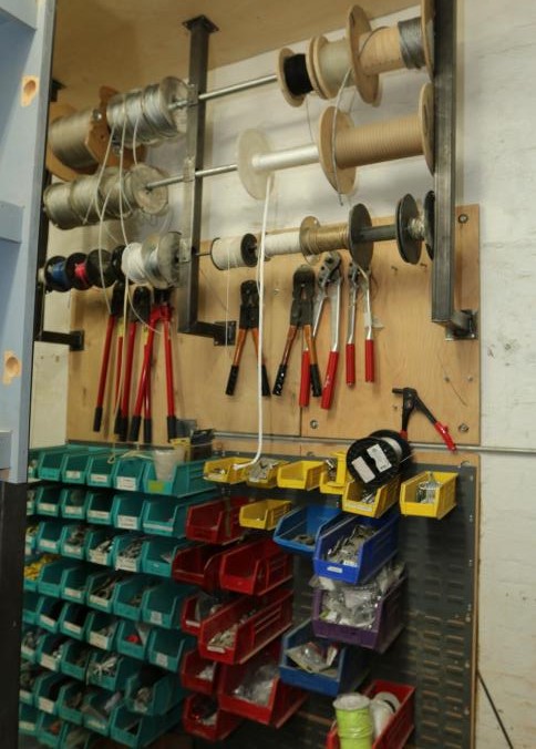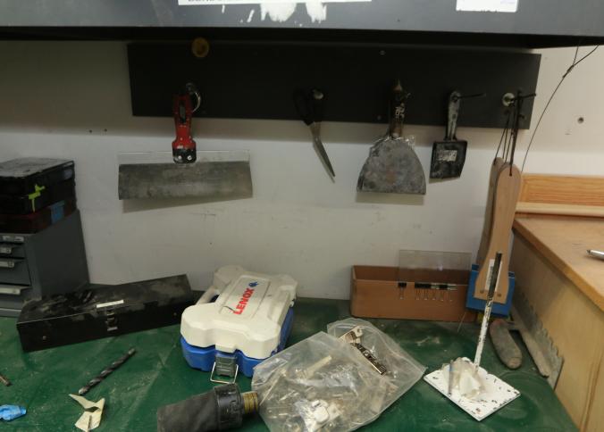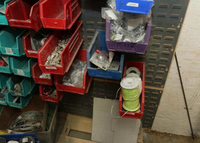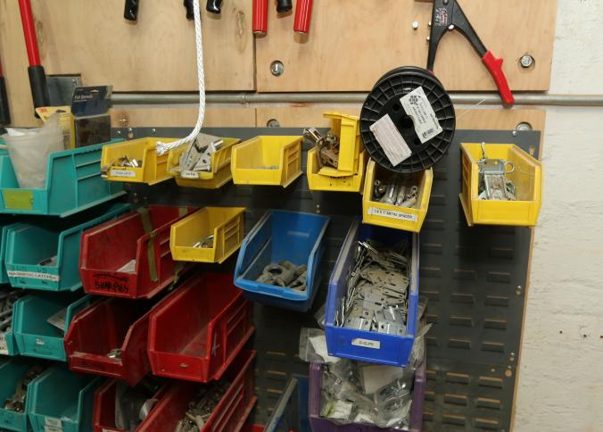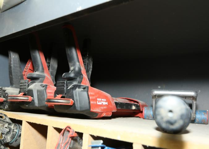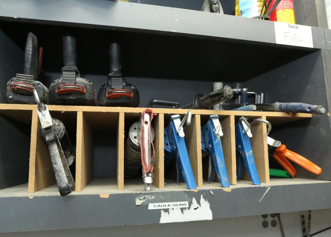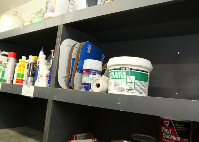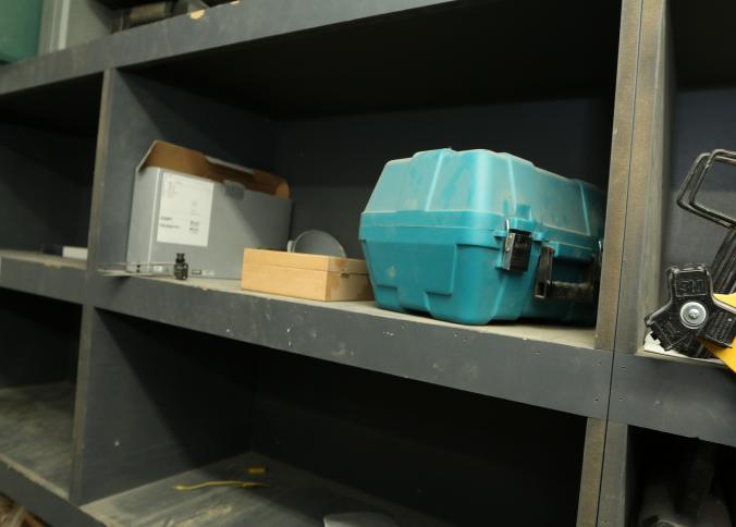 Hardware room right side wall and back wall, all storage mounted on them and contents including Hilti HDM 500 & MD2500 2 part mixing guns, caulk guns, tools, drill bits, speed bore bits, containers, bondo, tanks, hole saw parts, Elmer's glue, caulk, tool storage containers, crimping tools, eye bolts, assembly hardware, cabinet hinges, chain hardware, cable and accessories, U clamps, string, wire, sanding pads, etc. Buyer must take all. Excludes center section and left wall. Pickup can be completed on both days.