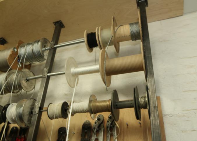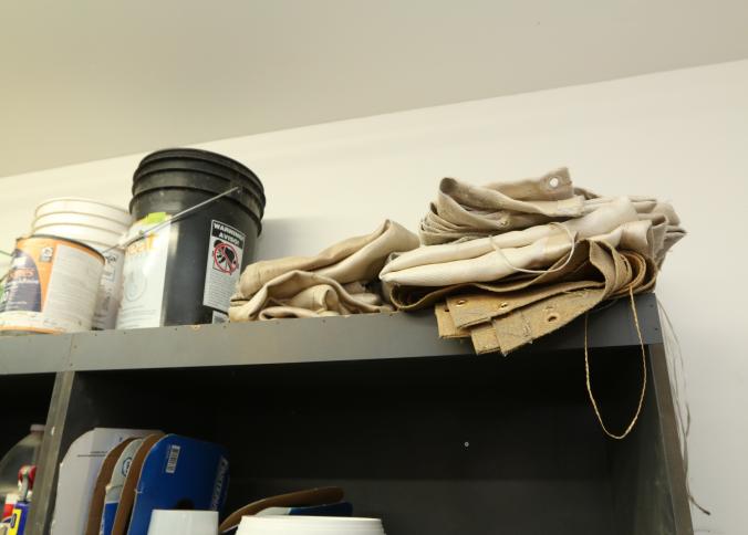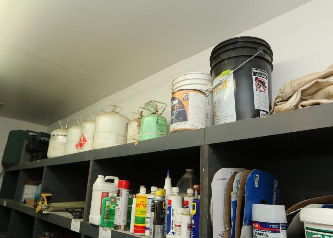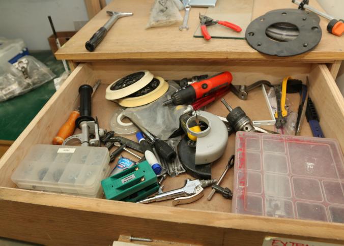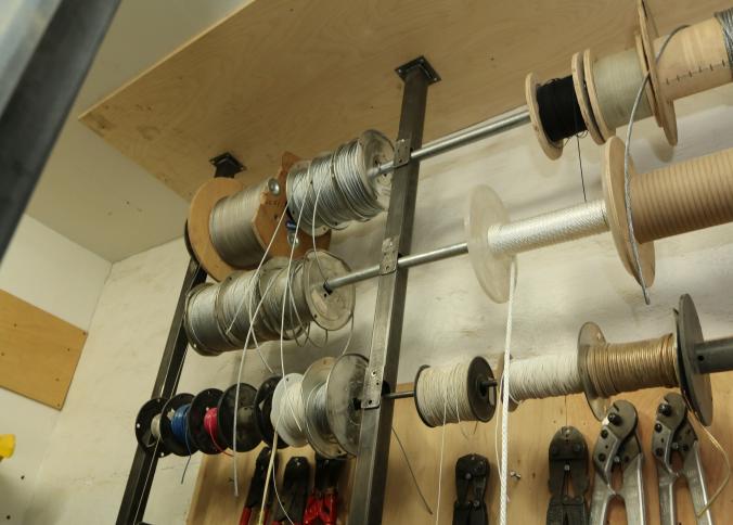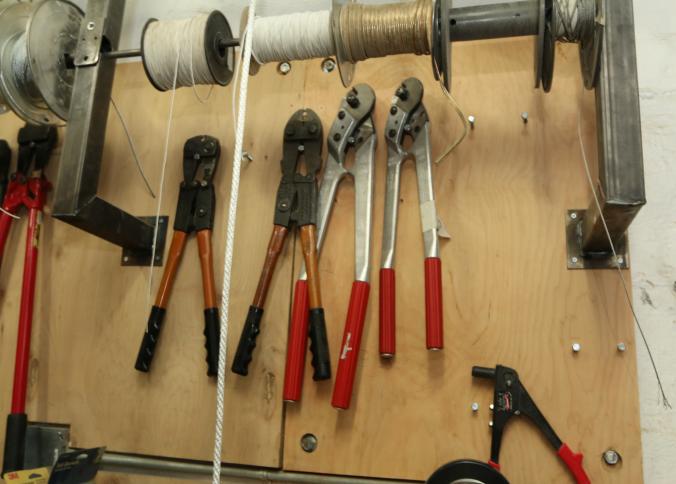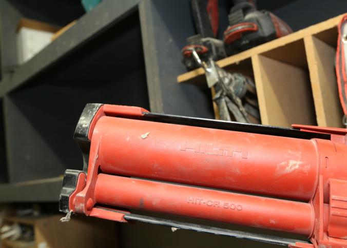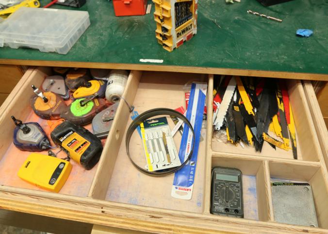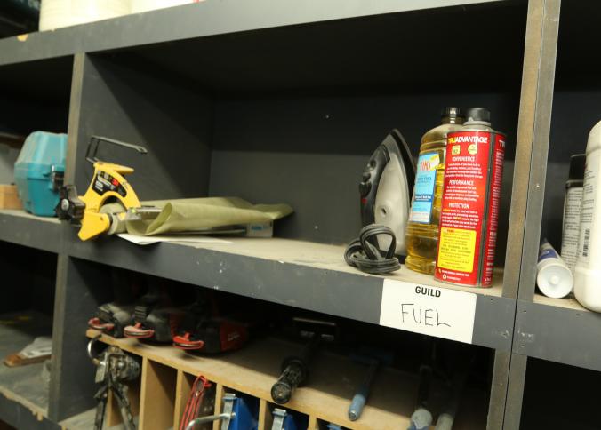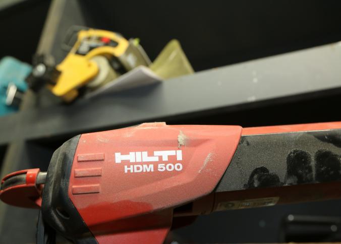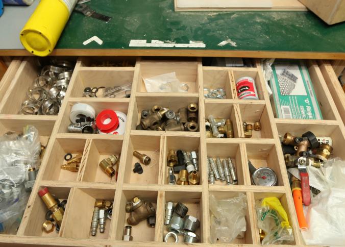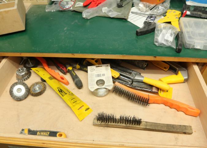 Hardware room right side wall and back wall, all storage mounted on them and contents including Hilti HDM 500 & MD2500 2 part mixing guns, caulk guns, tools, drill bits, speed bore bits, containers, bondo, tanks, hole saw parts, Elmer's glue, caulk, tool storage containers, crimping tools, eye bolts, assembly hardware, cabinet hinges, chain hardware, cable and accessories, U clamps, string, wire, sanding pads, etc. Buyer must take all. Excludes center section and left wall. Pickup can be completed on both days.