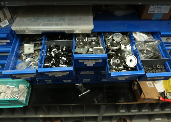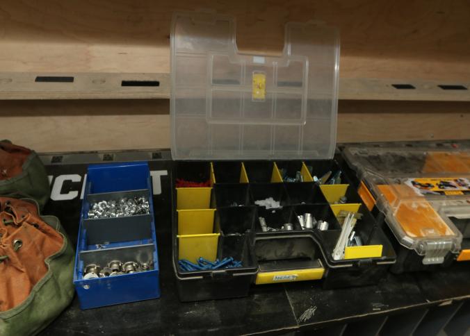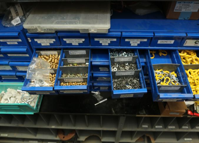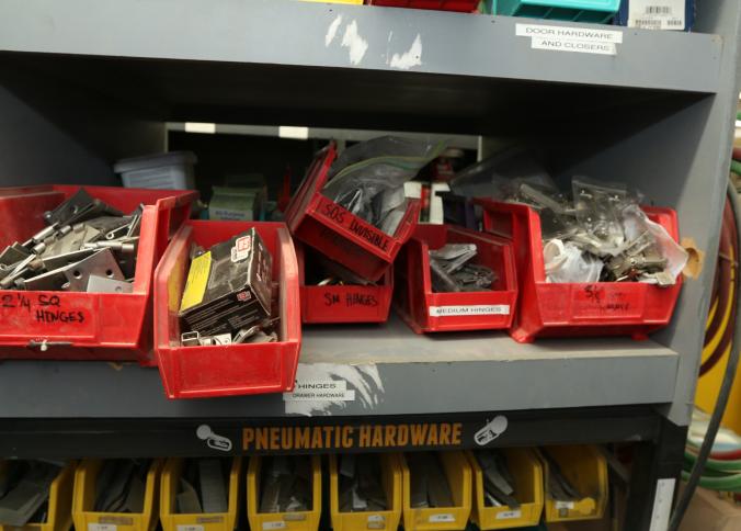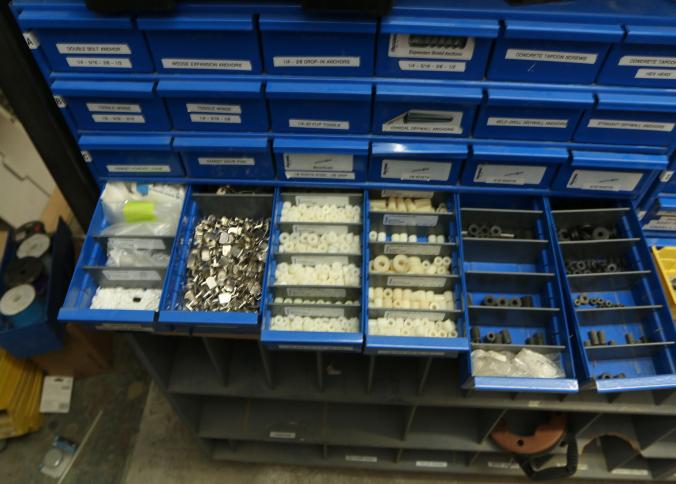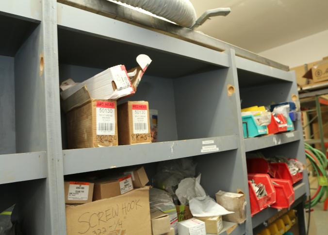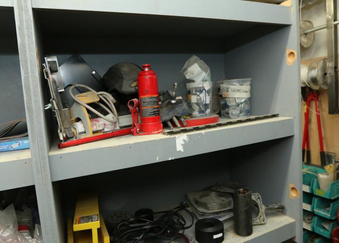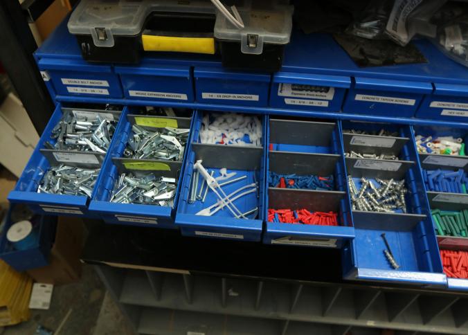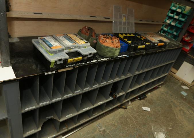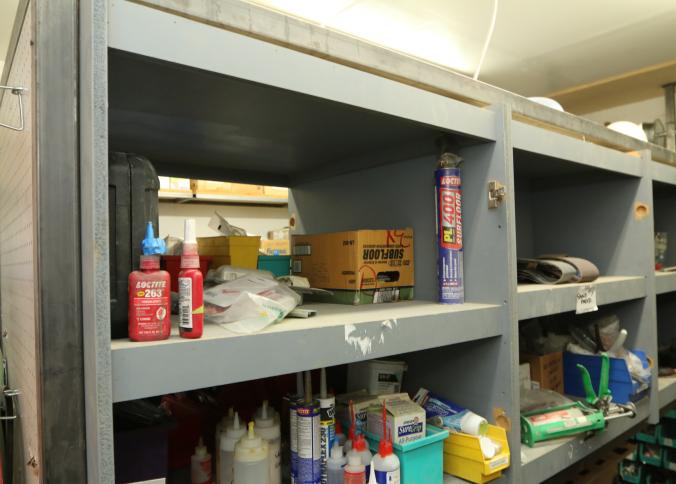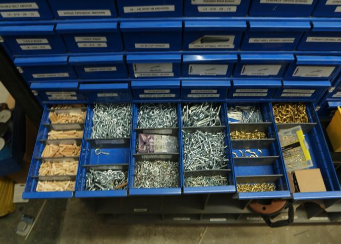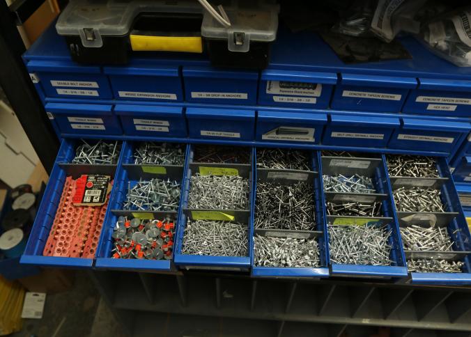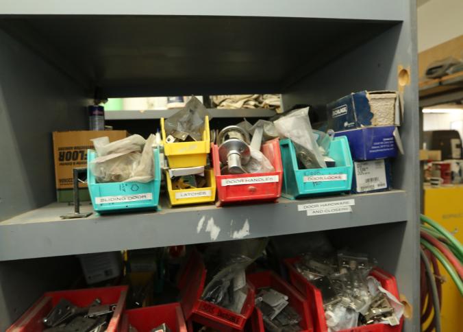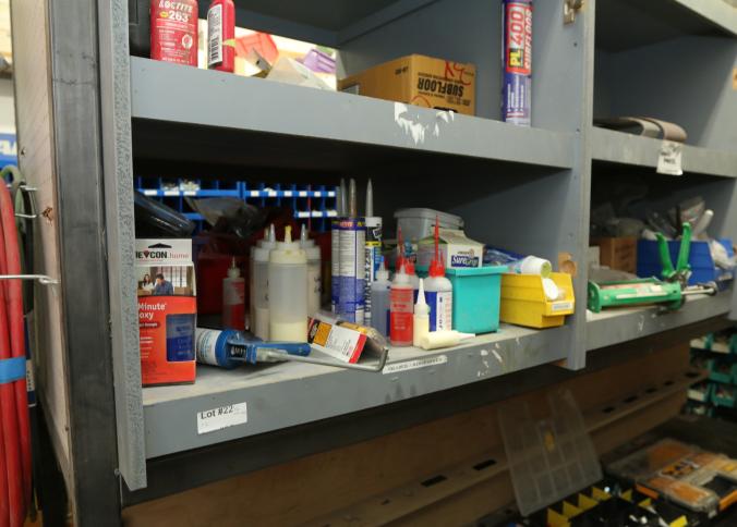 Hardware room center storage top and bottom including pic primer, Loctite, hardware, tap cons, rivets, bottle jack, wire, fan, nylon spacers, thimbles, sewage sleeves, threaded tube inserts, S hooks, cable clips, screw hooks, assortment of staples and finishing nails, and door hardware. Buyer must take all. Excludes left, right and rear walls. Pickup can be completed on both days.