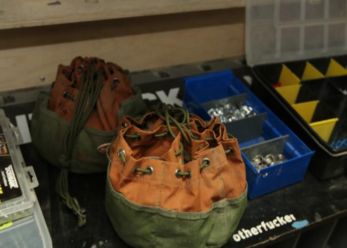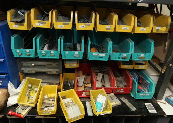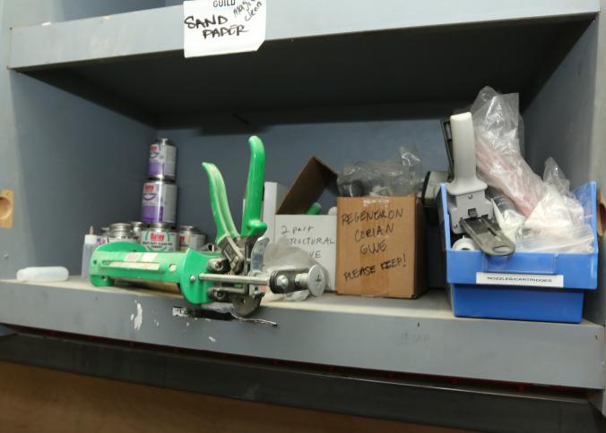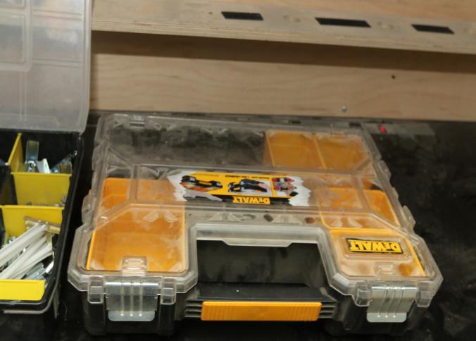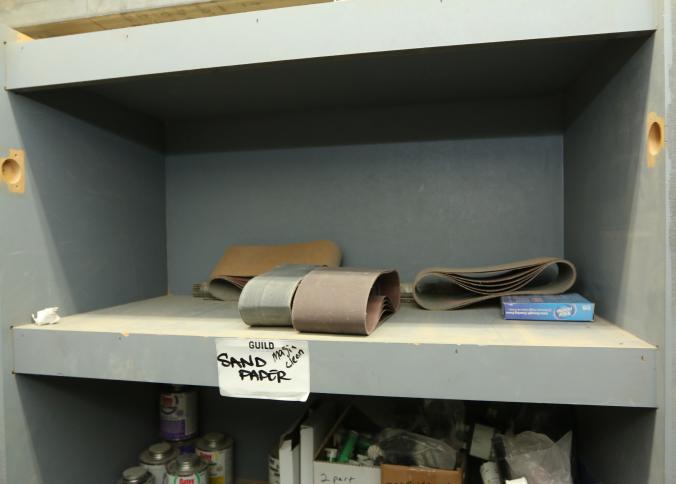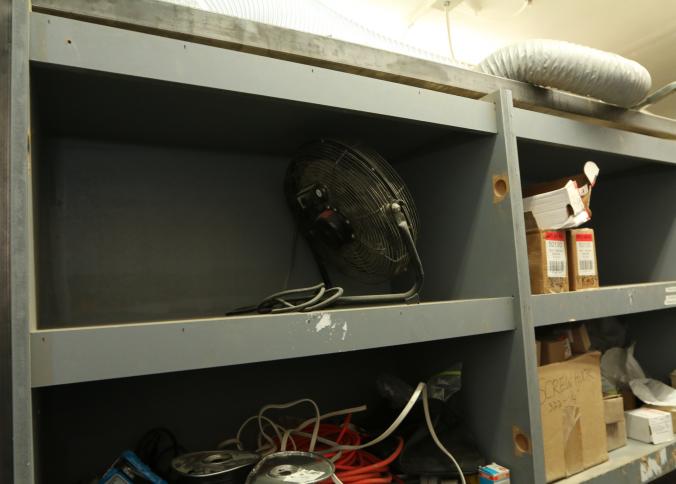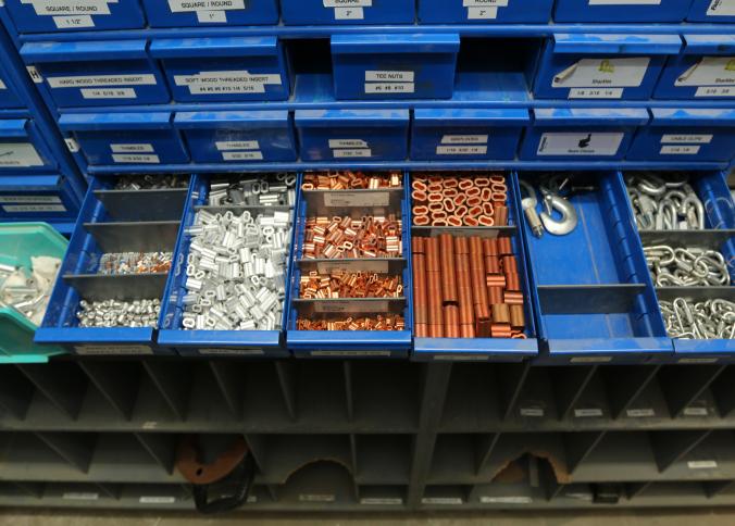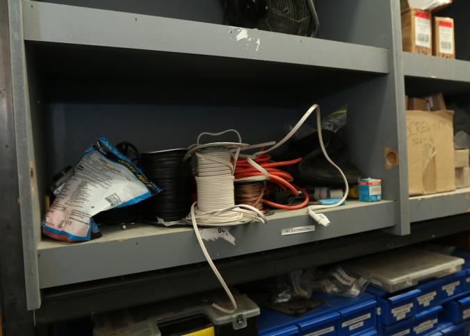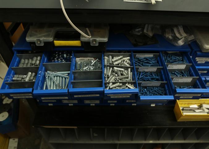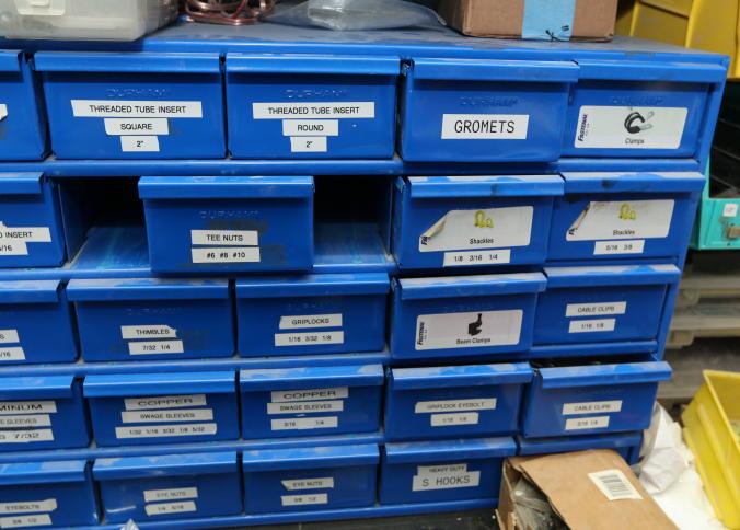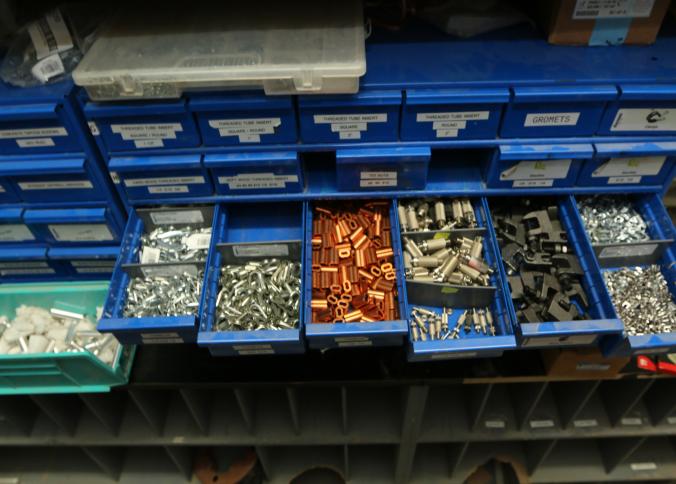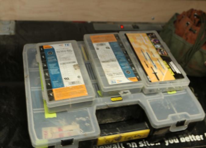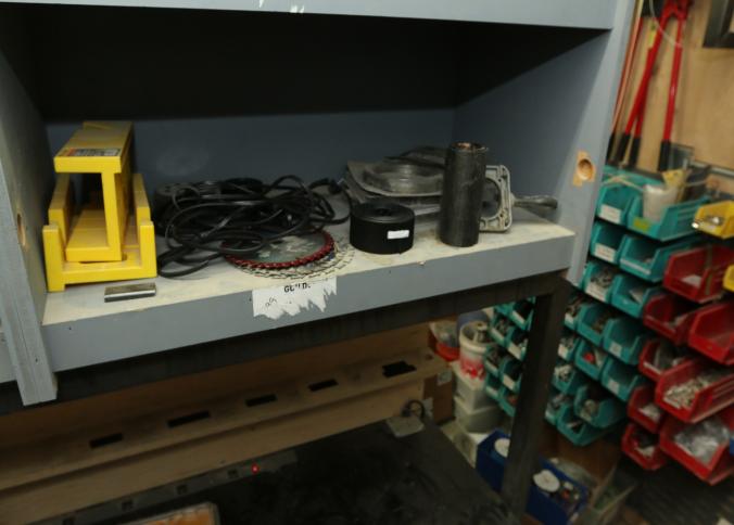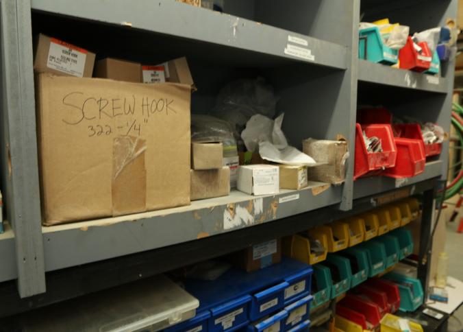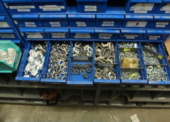 Hardware room center storage top and bottom including pic primer, Loctite, hardware, tap cons, rivets, bottle jack, wire, fan, nylon spacers, thimbles, sewage sleeves, threaded tube inserts, S hooks, cable clips, screw hooks, assortment of staples and finishing nails, and door hardware. Buyer must take all. Excludes left, right and rear walls. Pickup can be completed on both days.