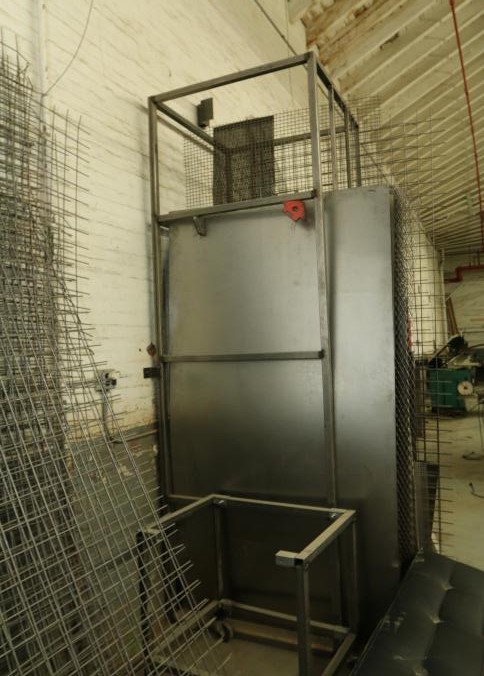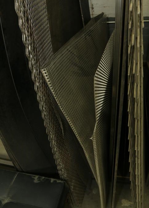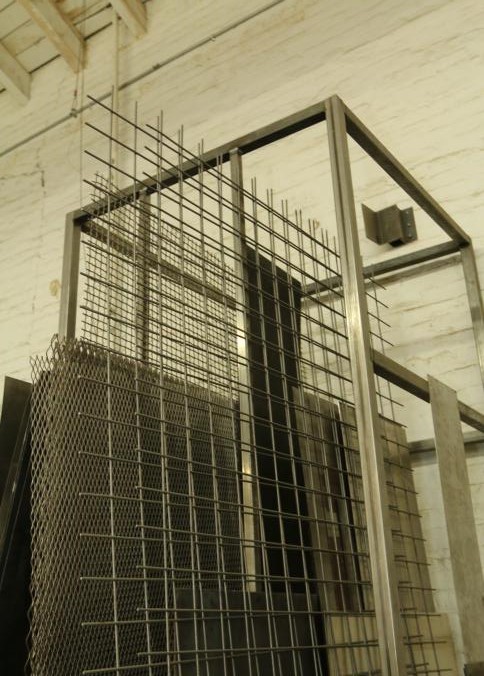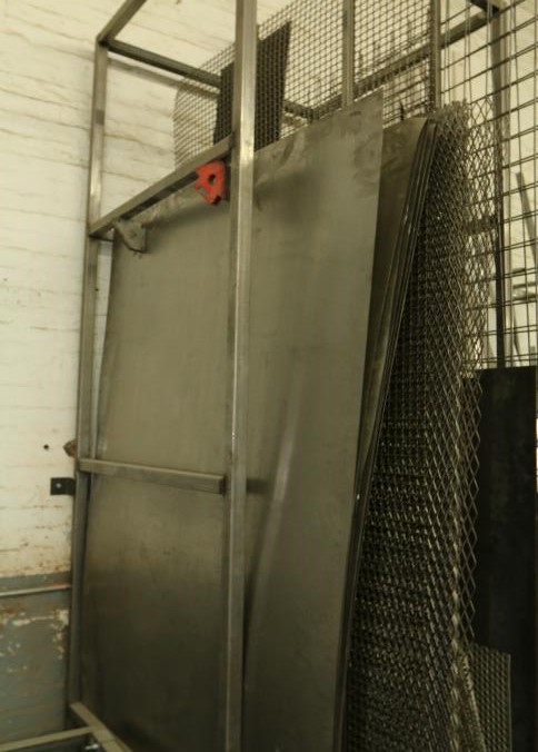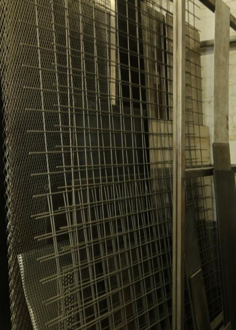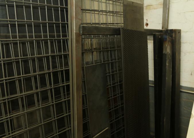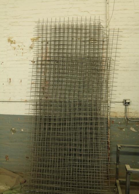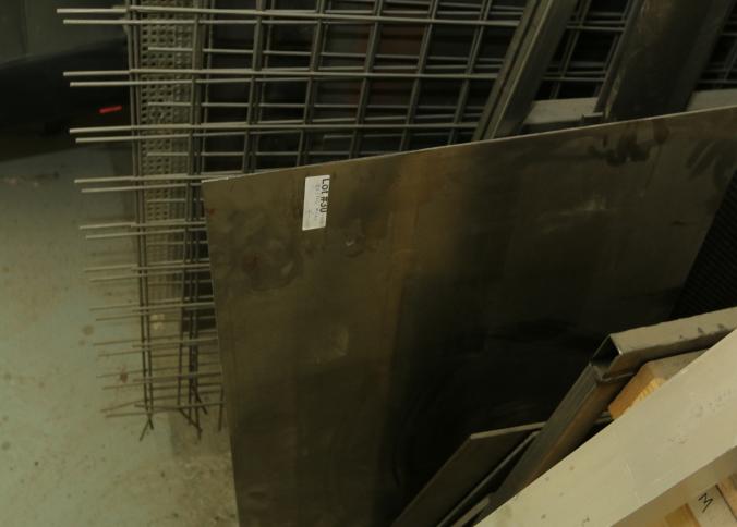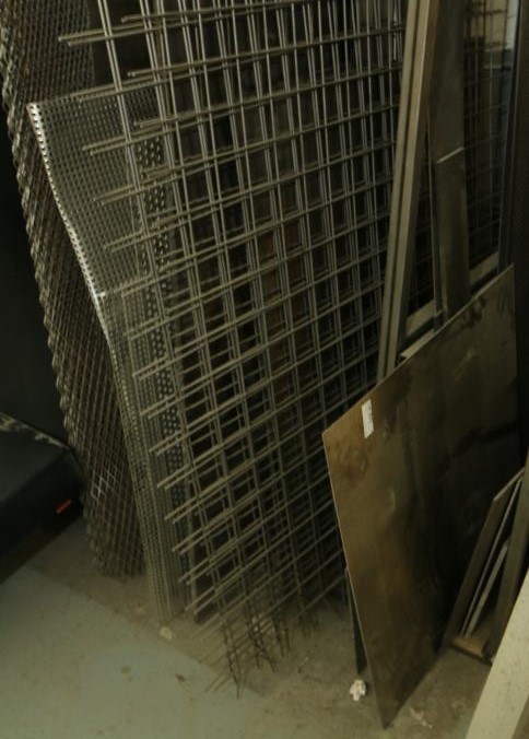 Steel sheet racking including the metal sheet goods it contains and the metal sheet mesh, sheets leaning up against the back wall. Contents include mesh, expanded metal, woven mesh, punched metal and regular sheet metal up to 1/2 inch thick. Largest piece measuring approx 52"x120". Buyer must take all. Buyer is responsible for the proper and safe removal including bringing the proper tools, and help. Pickup can be completed on both days.