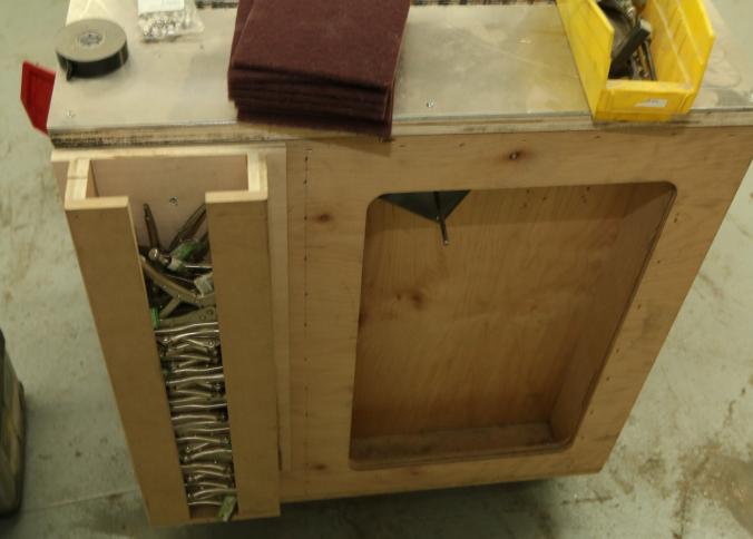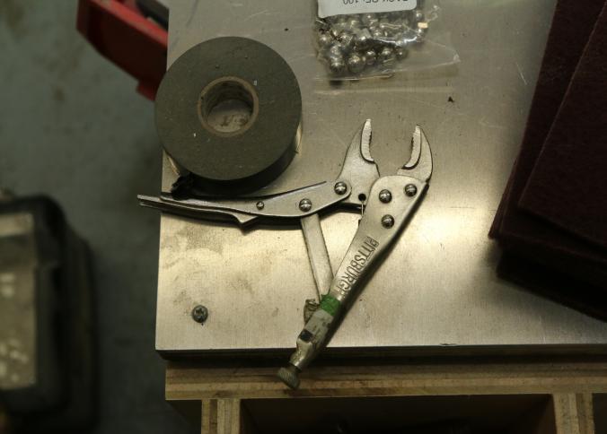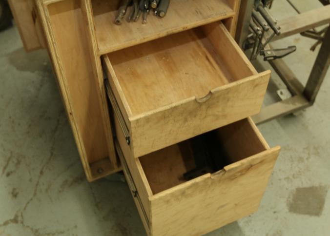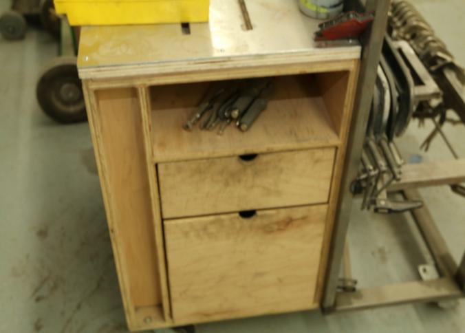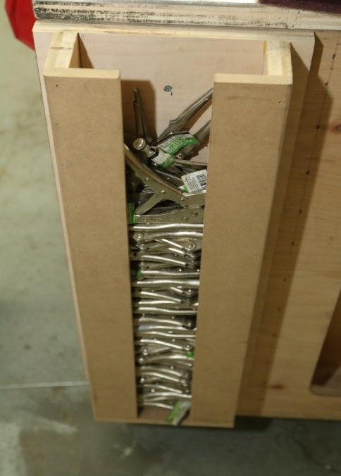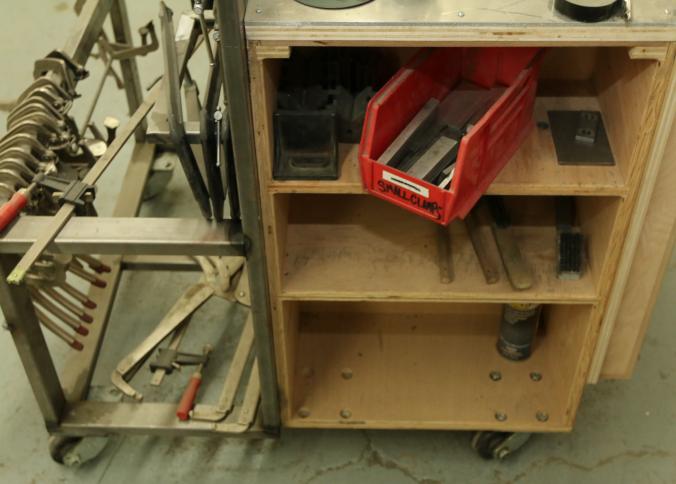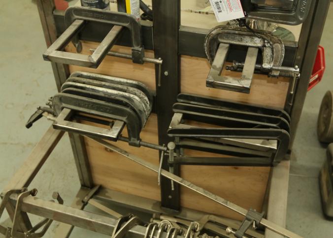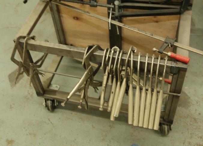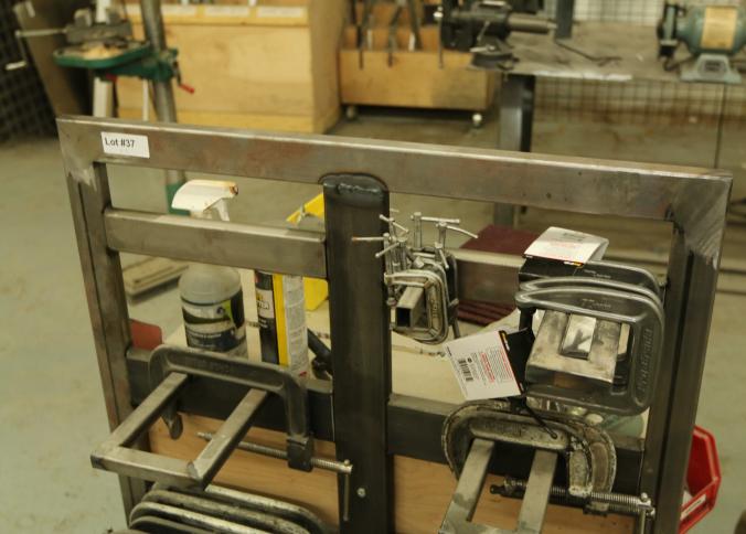 Clamp and vice rack, metal construction attached to wooden storage cabinet. Wide assortment of sizes. Unit measures approx 32"x40"x48"t. Buyer must take all. Pickup can be completed on both days.
