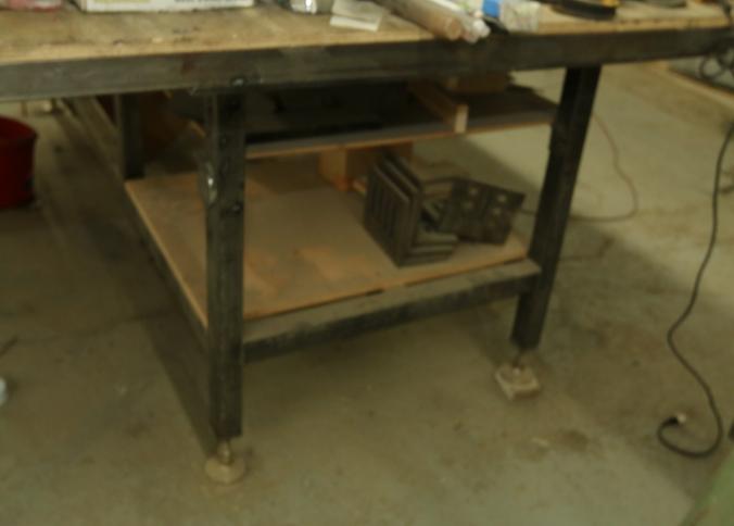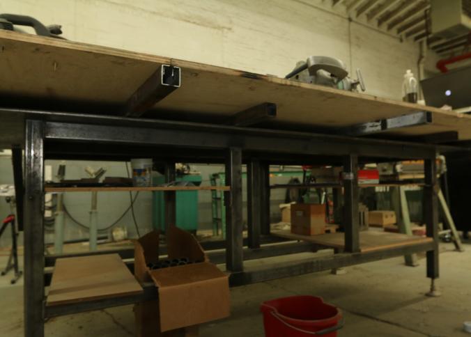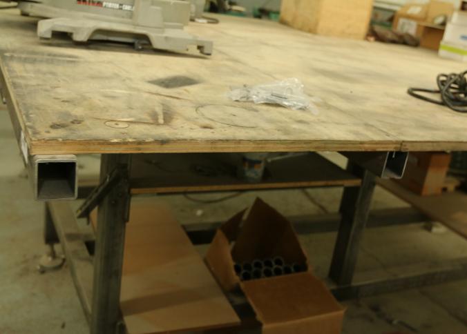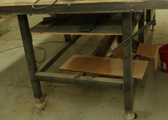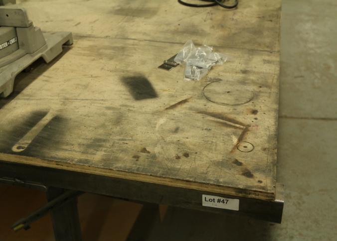 Steel frame wood top table, measuring approx 120"x80"x42"t with under table storage shelving. Excluding contents. Pickup can be completed on both days.
