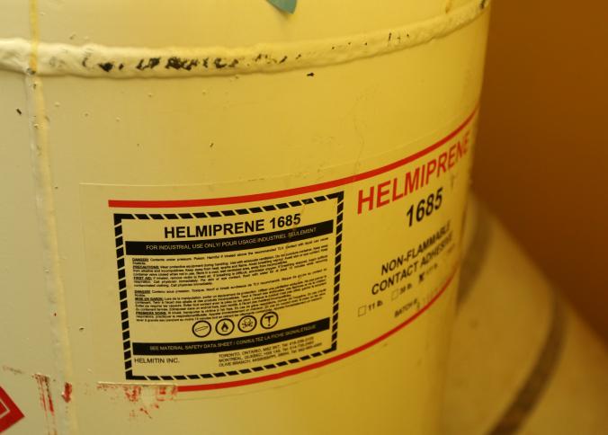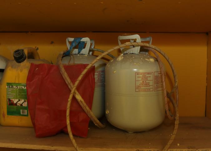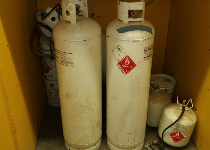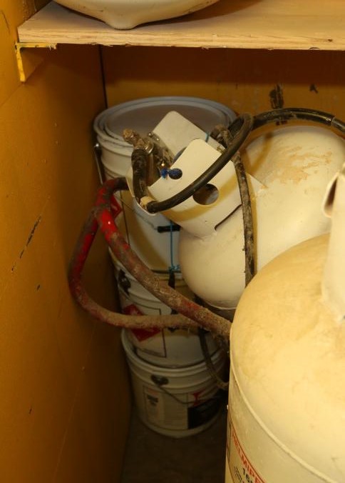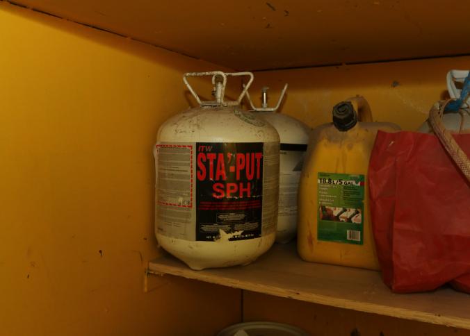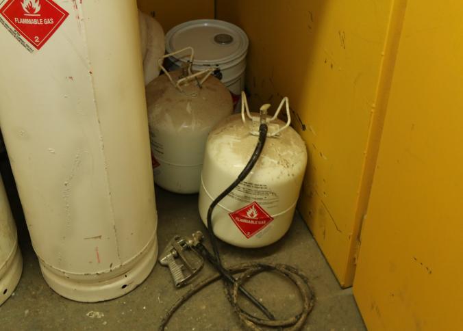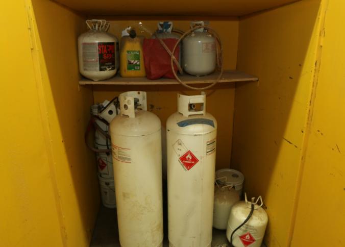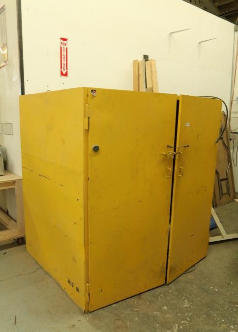 Locking chemical storage cabinet and contents including spray adhesives. Measures approx 63"x51"x73" t. Buyer must take all. Pickup can be completed on both days.