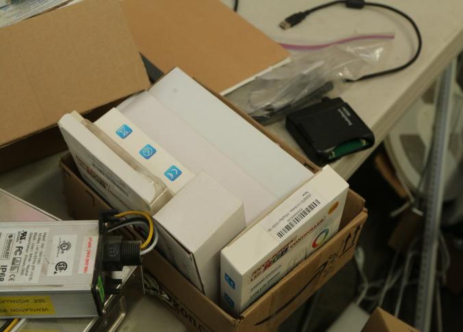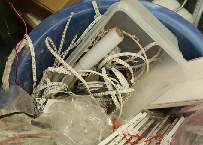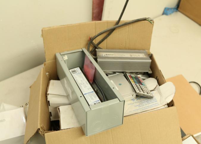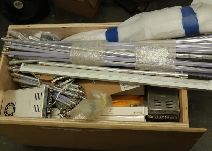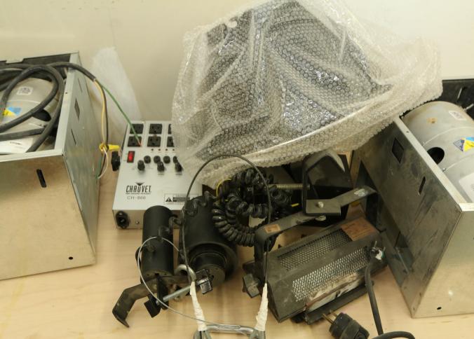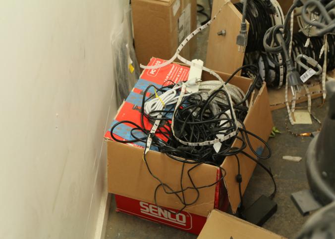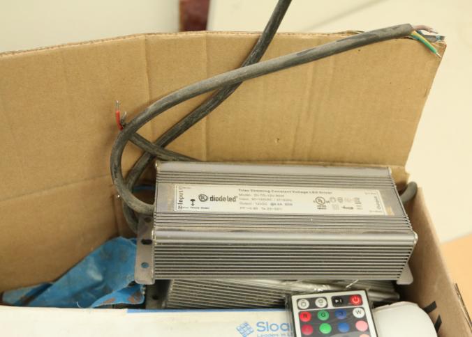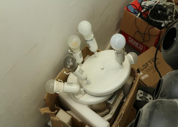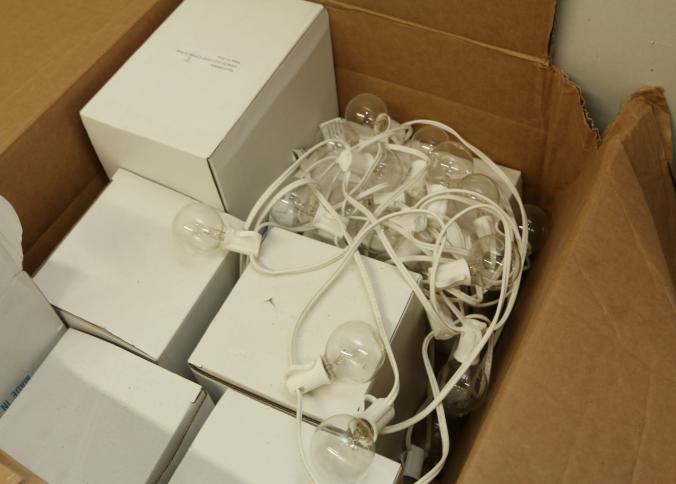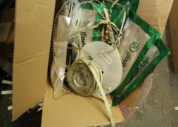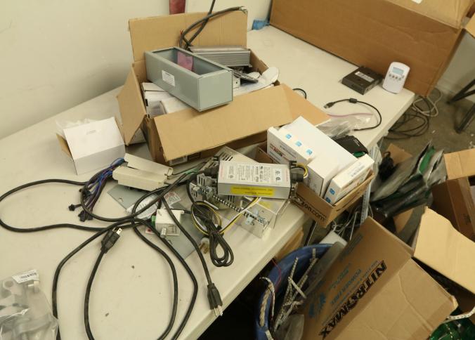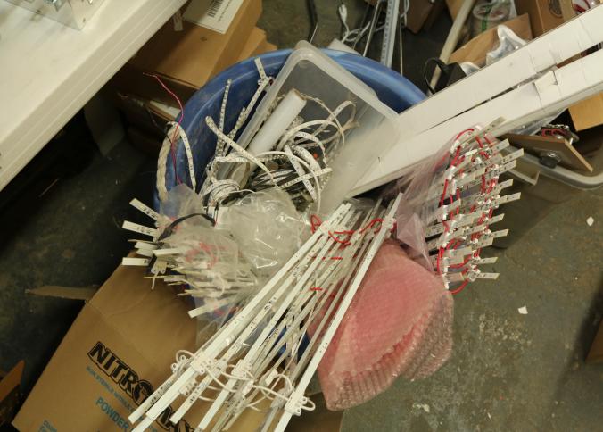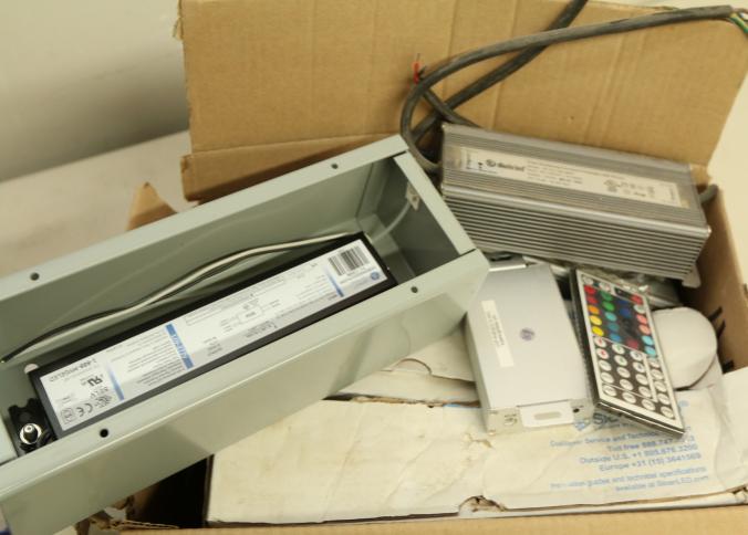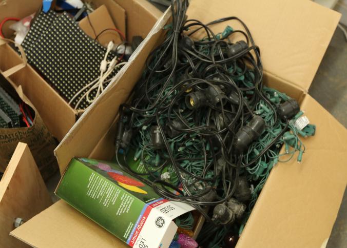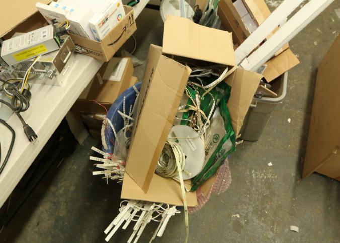 Contents of room including light strings, clamps, fluorescent light fixture, Christmas lights, work lights, small fans, residential light fixtures, LED strings, low voltage power supplies, LED arrays. Buyer must take all. Excluding light rack and other lots. Pickup can be completed on both days.
