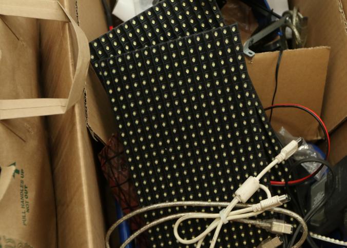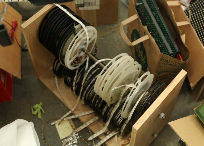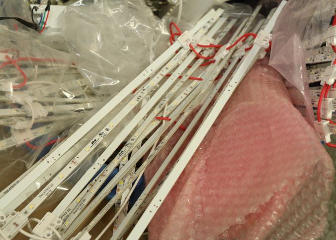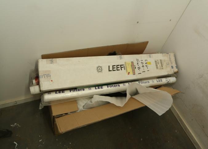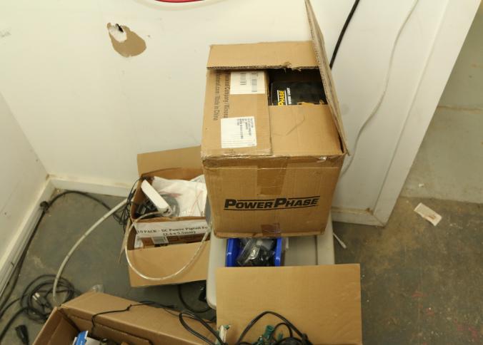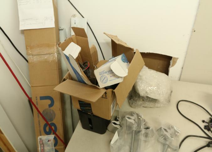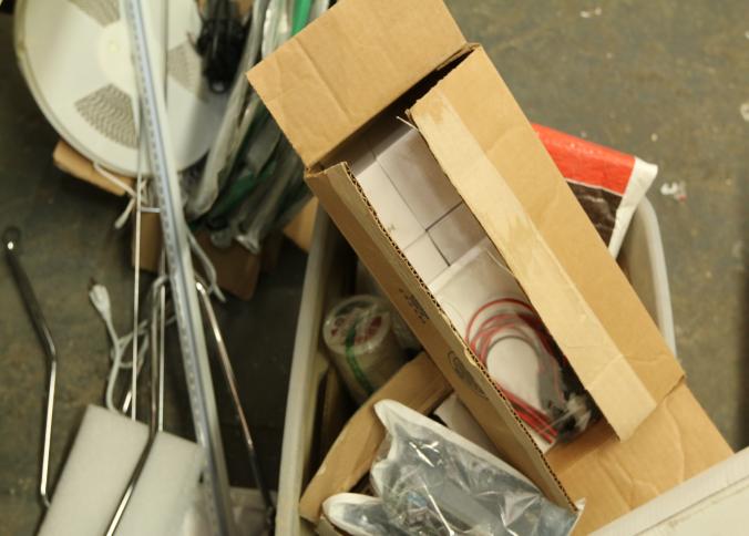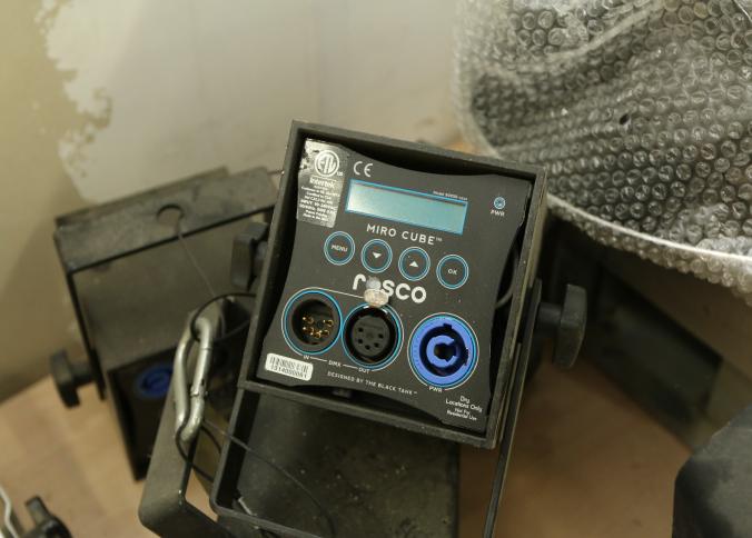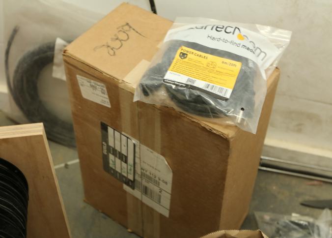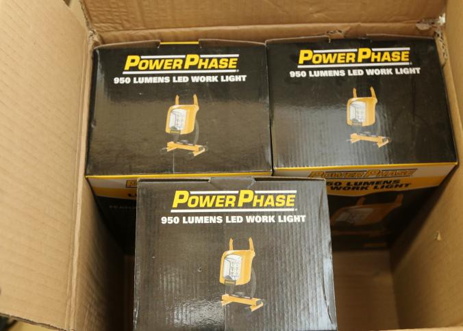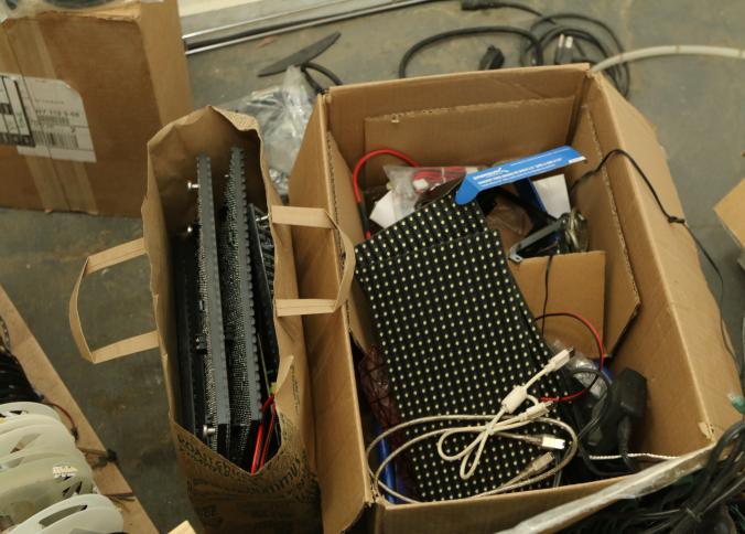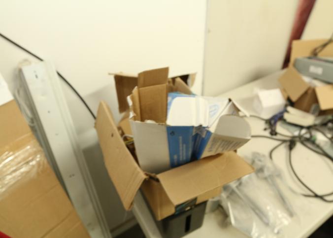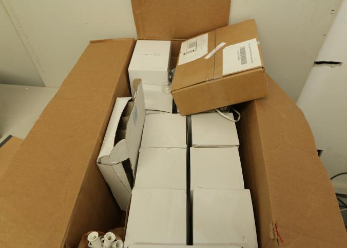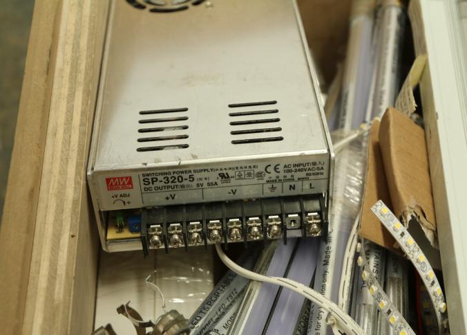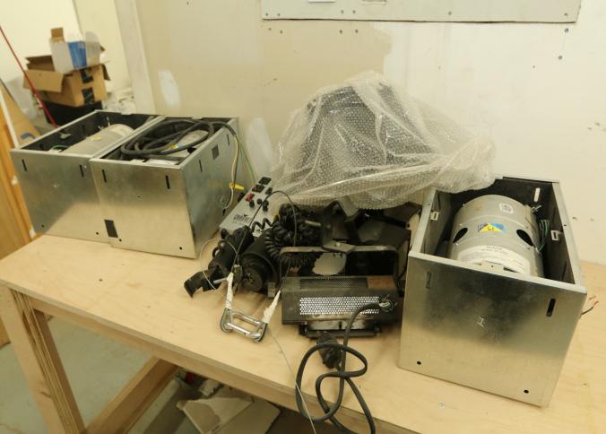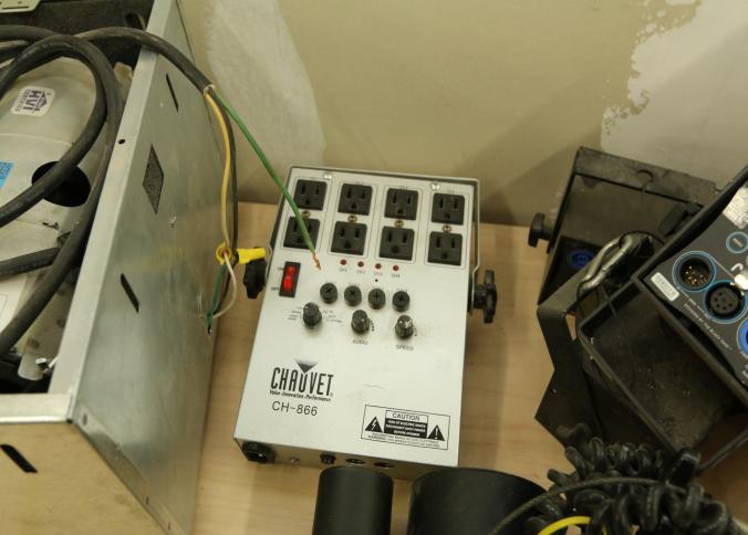 Contents of room including light strings, clamps, fluorescent light fixture, Christmas lights, work lights, small fans, residential light fixtures, LED strings, low voltage power supplies, LED arrays. Buyer must take all. Excluding light rack and other lots. Pickup can be completed on both days.