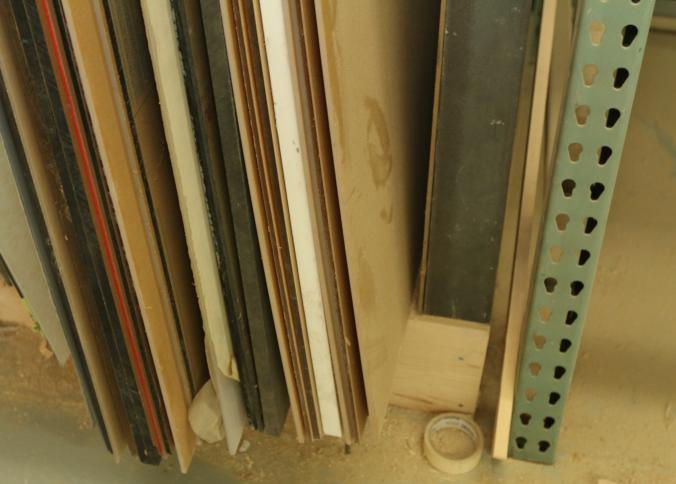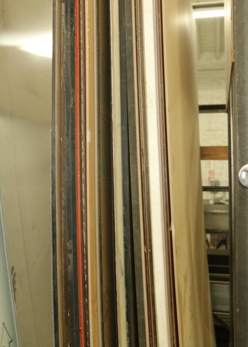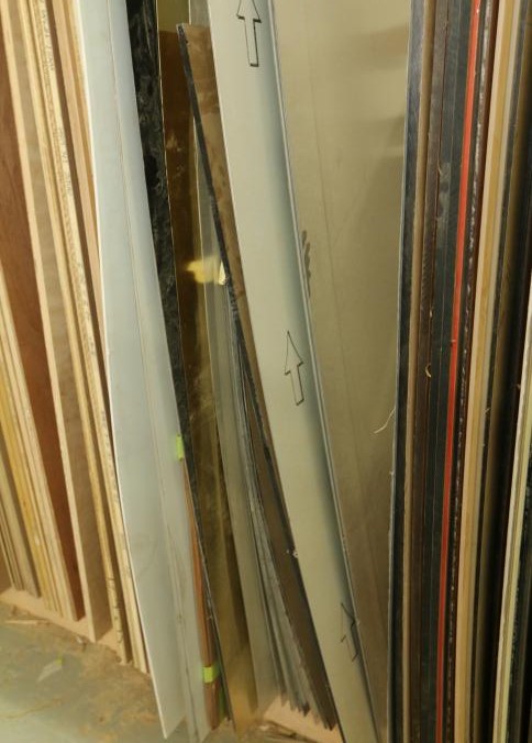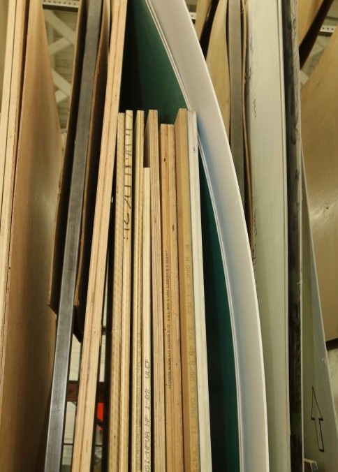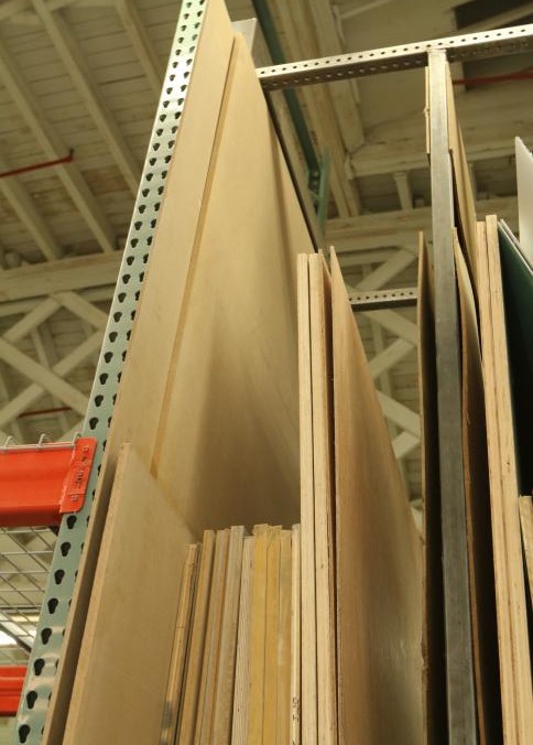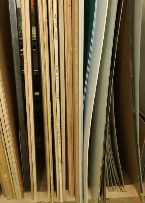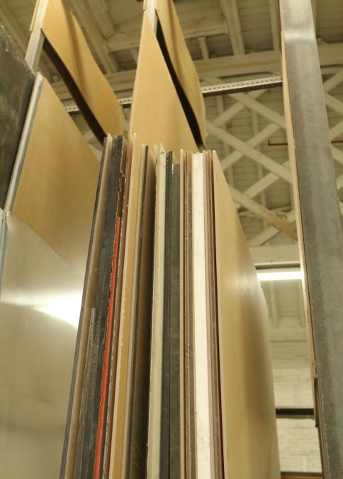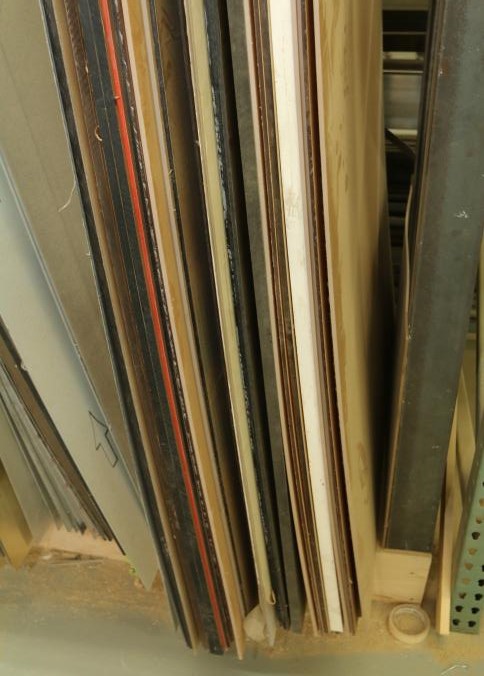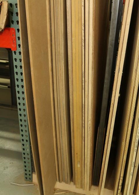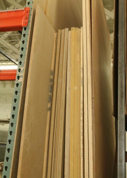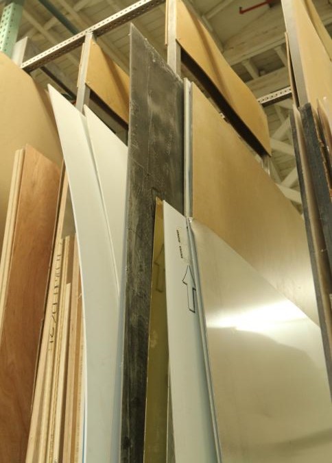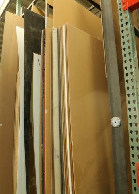 Sheet goods storage rack measuring approx 80"x36"x165"t and all sheet stock within including five pieces of 1/2", two pieces of 3/8", several pieces of 1/4", acrylic or Lexan 48"x96" plastic sheeting. Several varieties of laminated wood sheets, particle board, fiber board measuring approx 1/8" to 1" thick. Several sheets of thin gauge sheet metal. Buyer must take all. Excluding other lots. Pickup can be completed on both days.