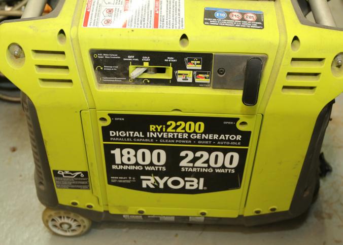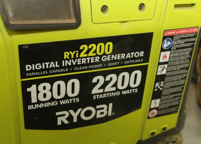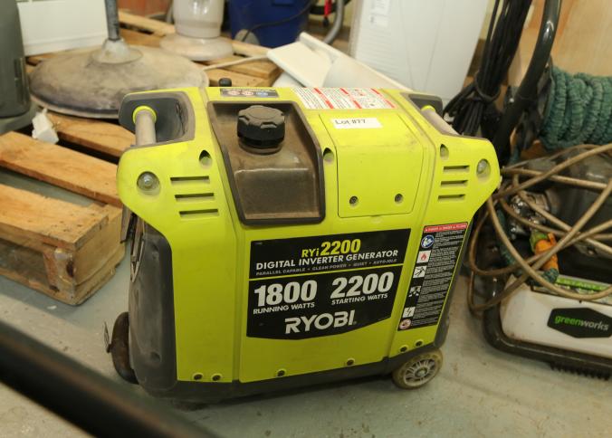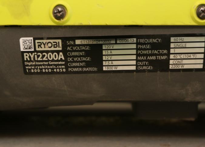 Ryobi model RYi2200 portable digital inverter generator. 1800 watts continuous, 2200 watts starting, parallel capable. Measures approx 22"x11"x17"t. Pickup can be completed on both days.