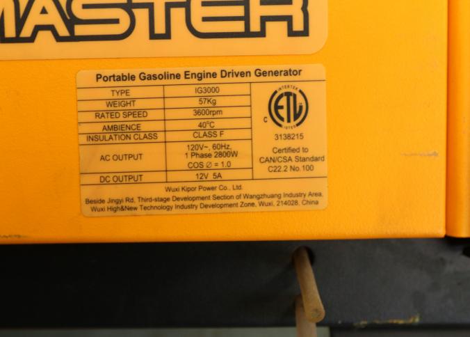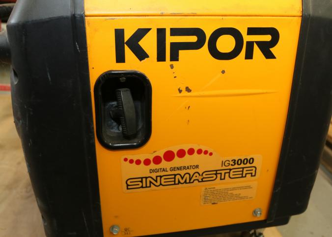 Kipor model IG3000 Sinemaster digital generator. Single phase output 120volts, 2800watts. DC output 12volts. Measures approx 28"x18"x22"t. Pickup can be completed on both days.