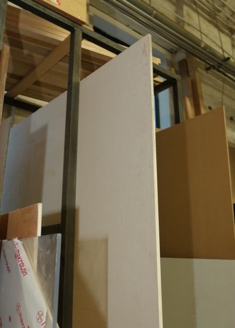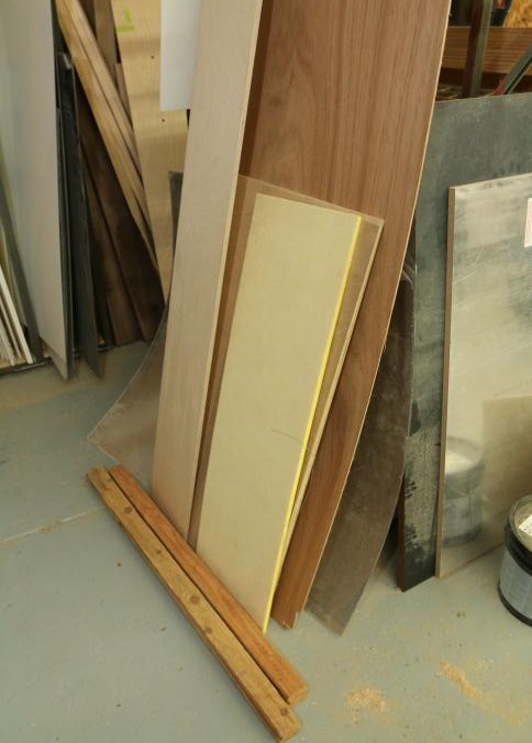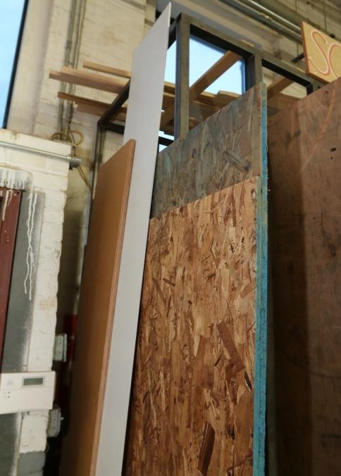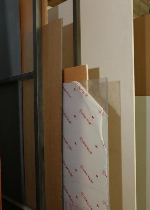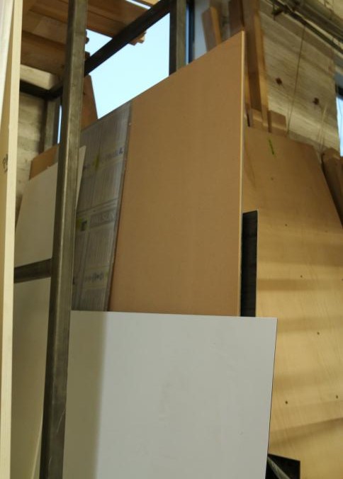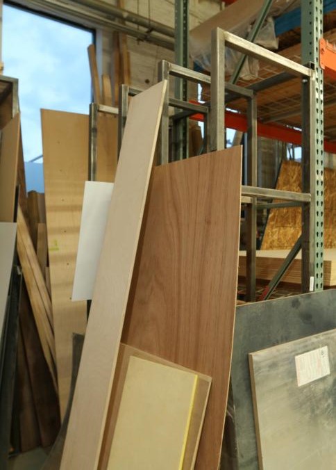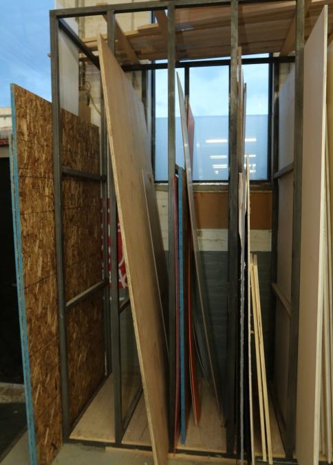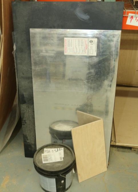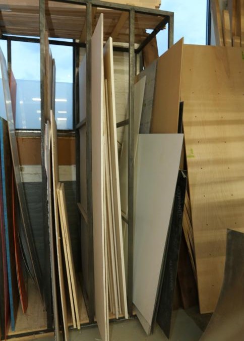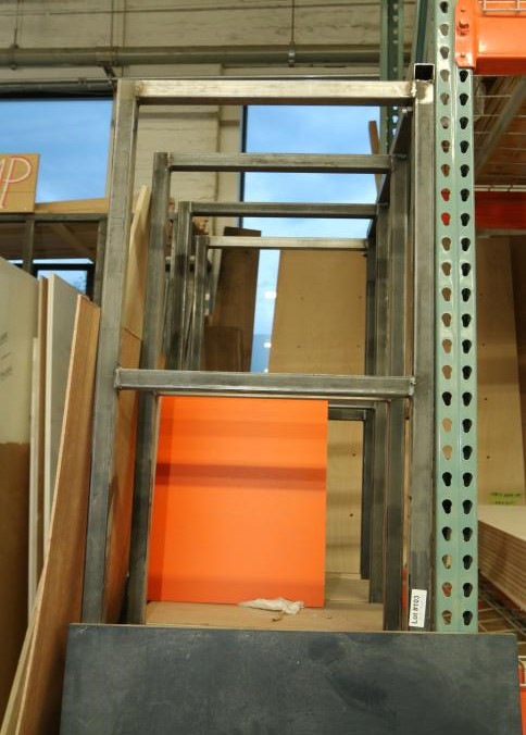 Various stock and racks including raw material, sheet metal, one piece of 3/4" plywood, one 3/4" OSB board, one 1/2" OSB board, Palight foamed PVC sheets, plexi glass, etc. Buyer must take all. Pickup can be completed on both days.
