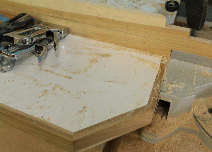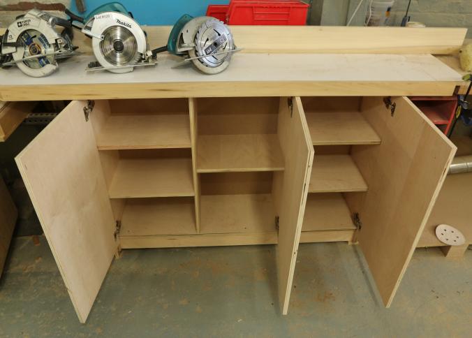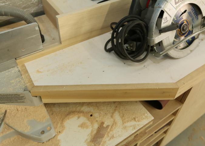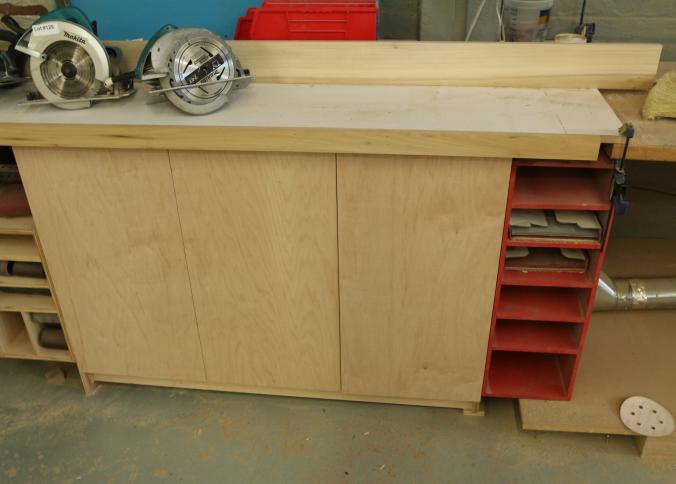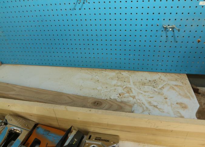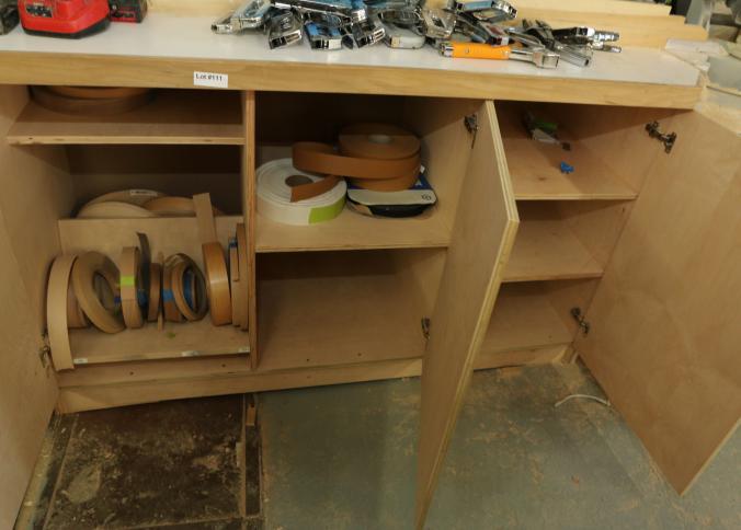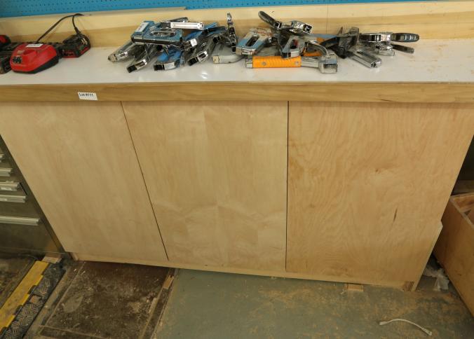 Miter saw tables with vertical guide. Wood construction with Formica tops. Left side measures approx 105"x33"x41"t, center is wall mounted and measures 37"x32"x24"t, right side measures 90"x33"x39"t. Excluding contents and other lots. Pickup must be completed Friday, September 9 by 3PM.