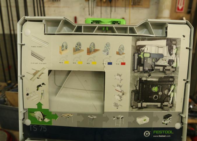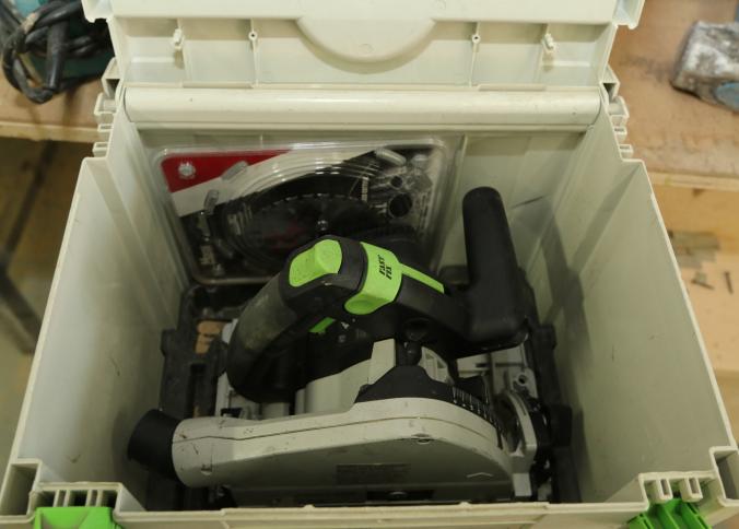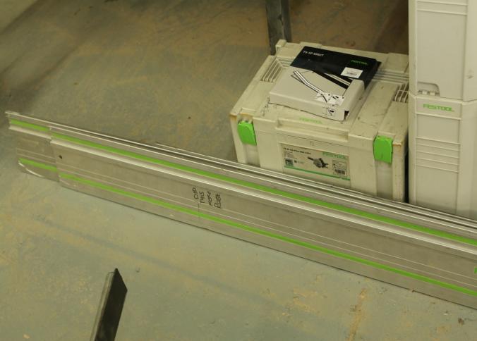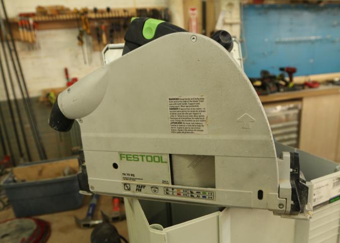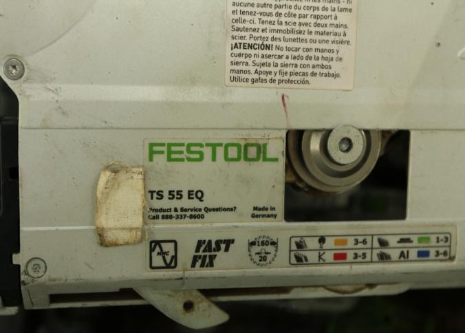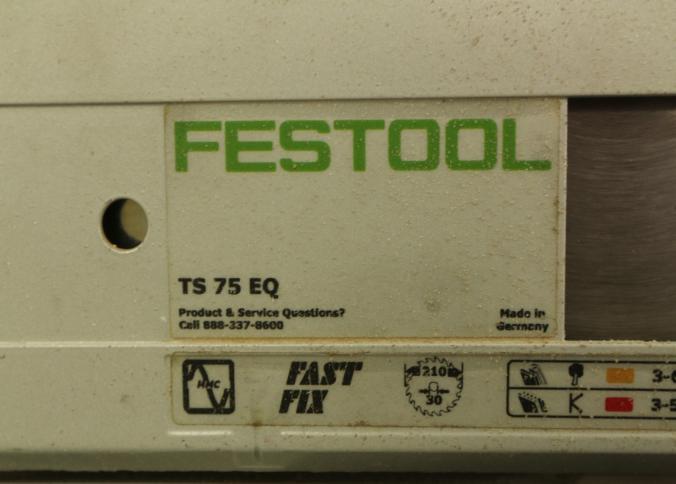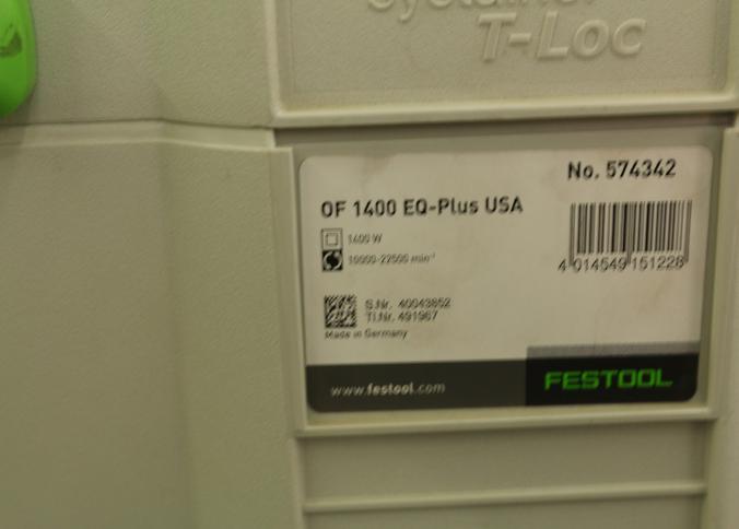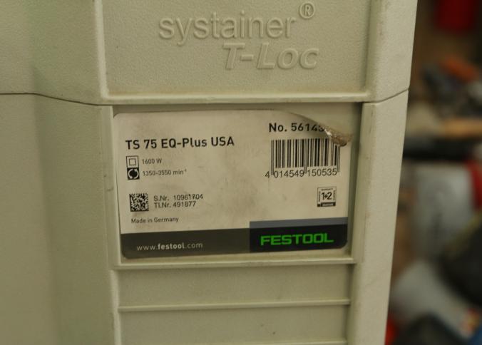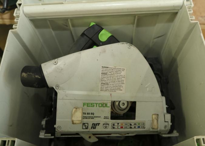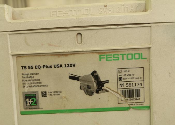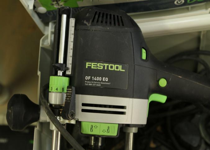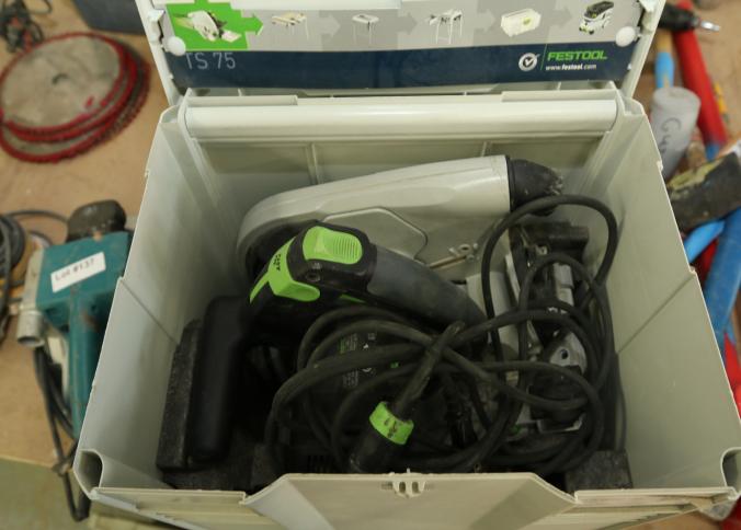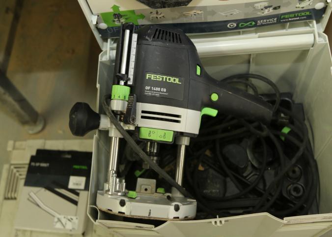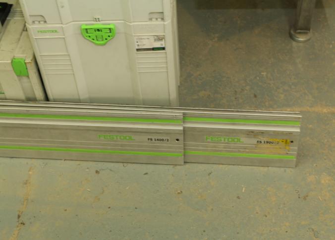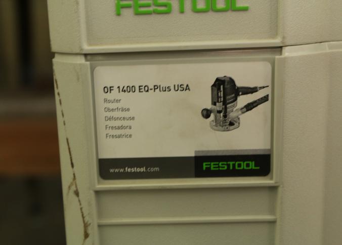 Three Festool power tools. Model OF1400 router, model TS 75 circular saw, and model TS 55 circular saw all with protective factory cases. Three pieces of Festool extruded aluminum track. Pickup can be completed on both days.