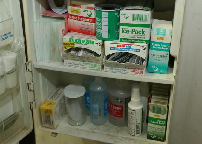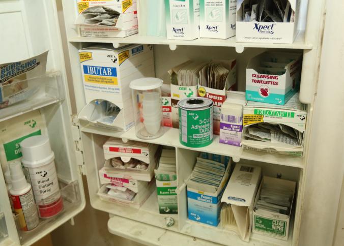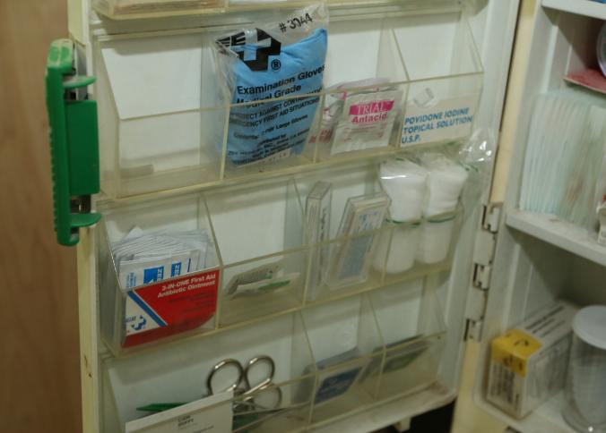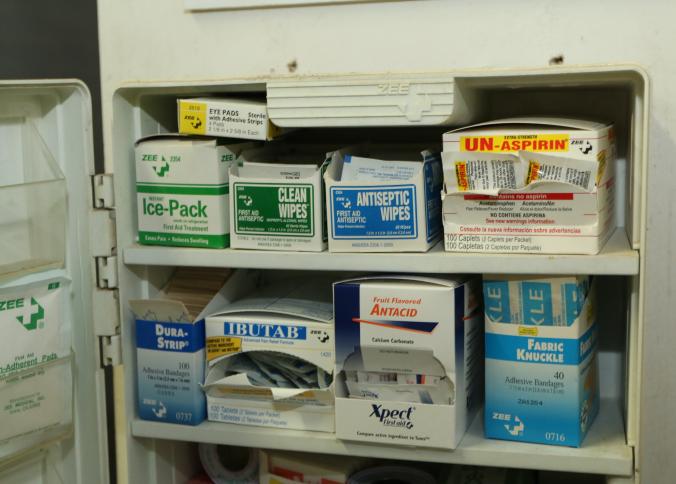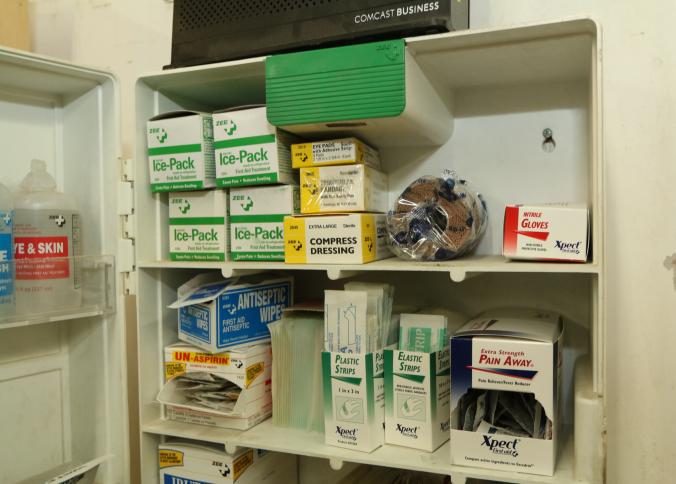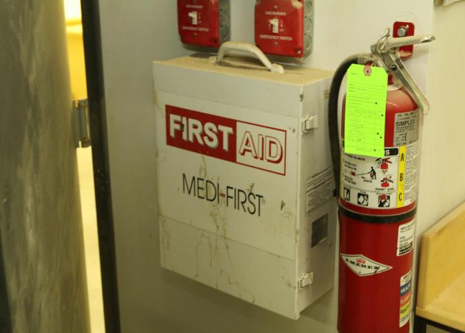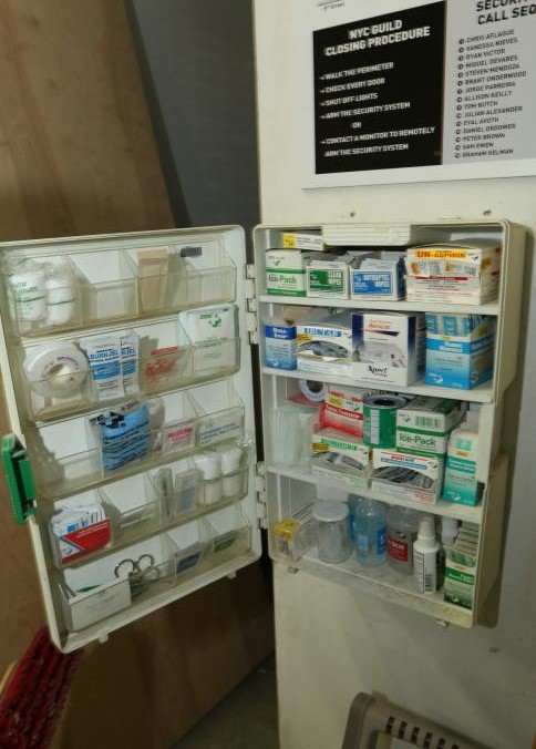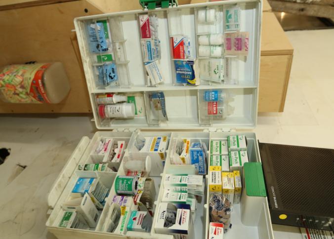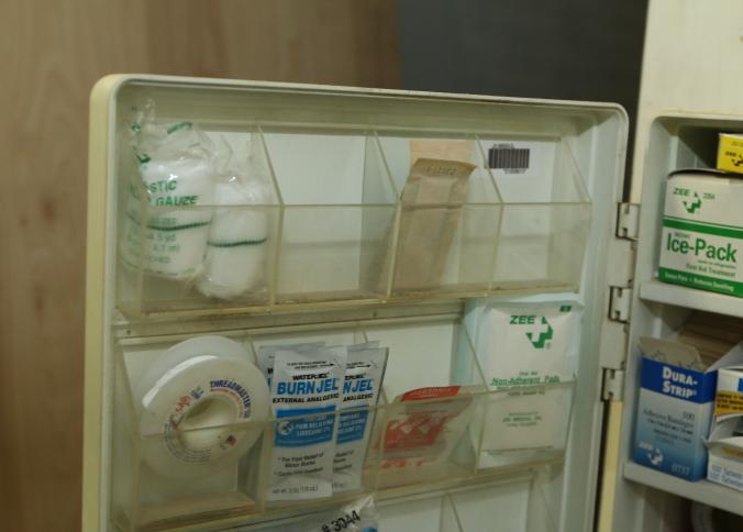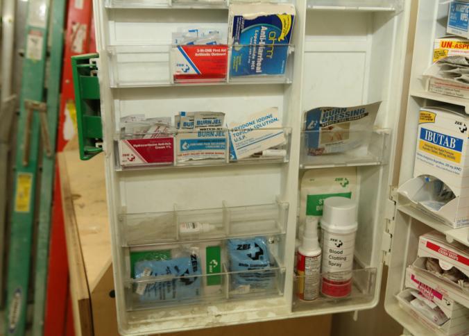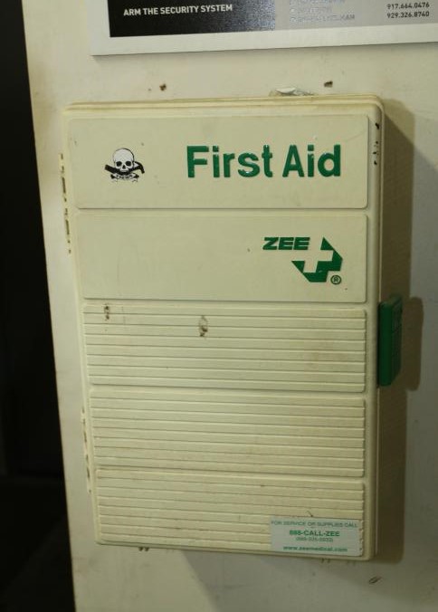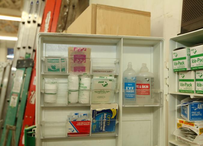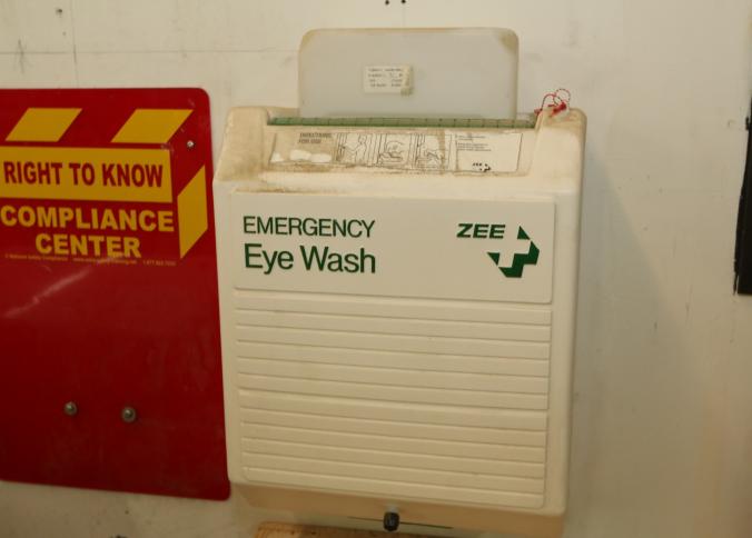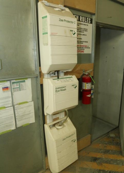 First aid storage racks throughout the shop incl 3 Zee emergency eye wash stations measuring . approx 15"x8"x21"t and one Protector 1 supply/drain expansion, Zee first aid station measuring approx 17"x9"x25"t. Buyer must take all. Pickup can be completed on both days.