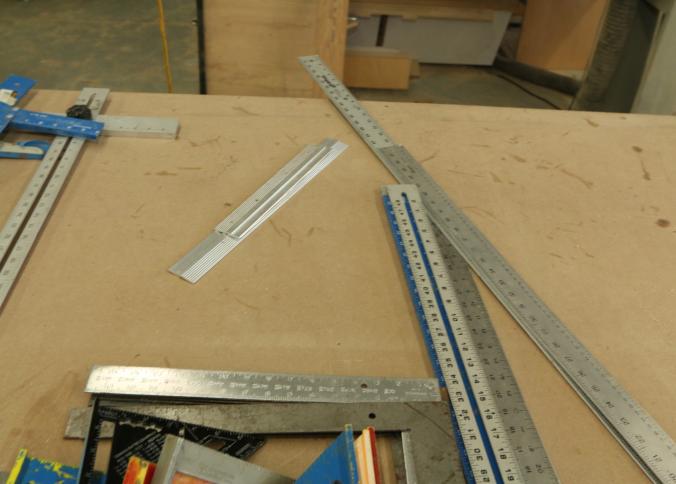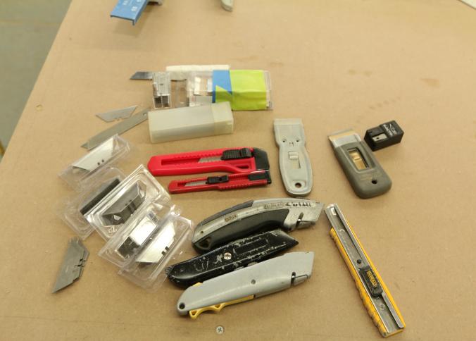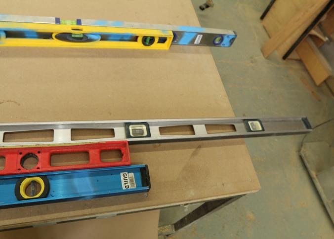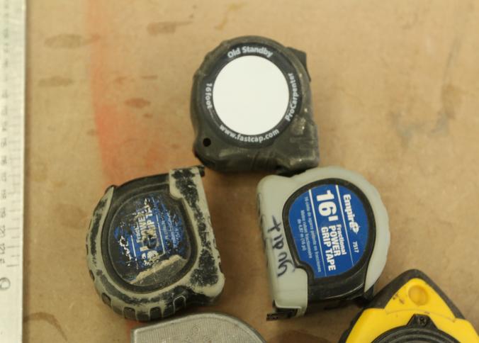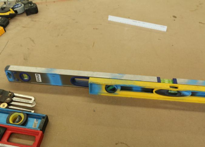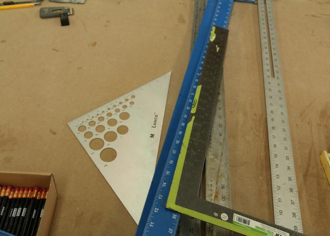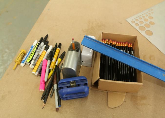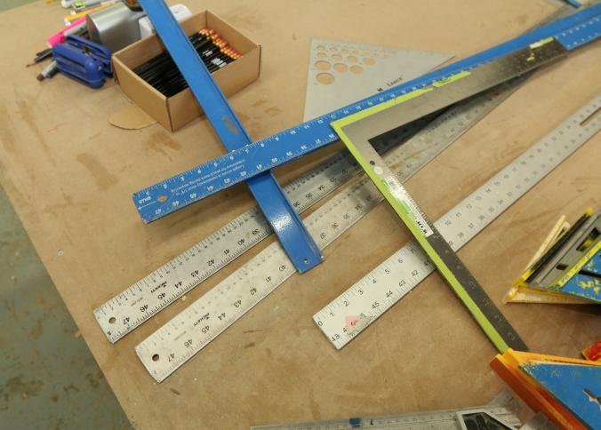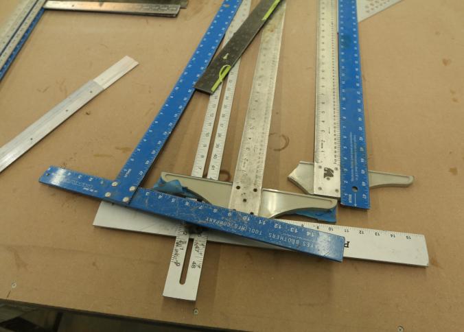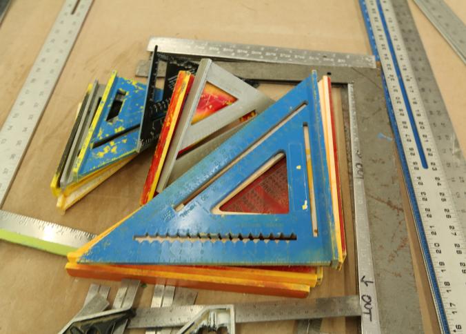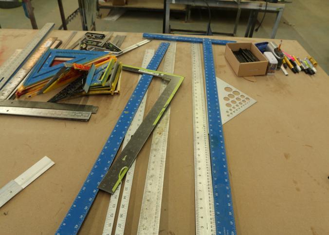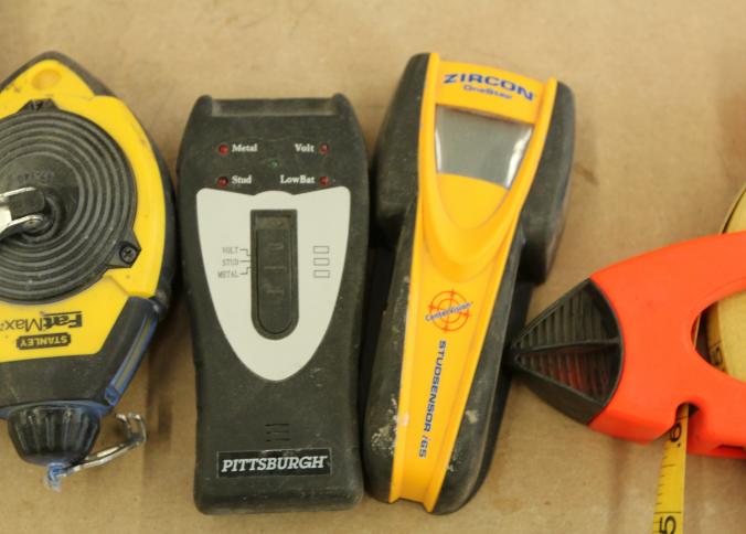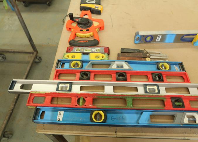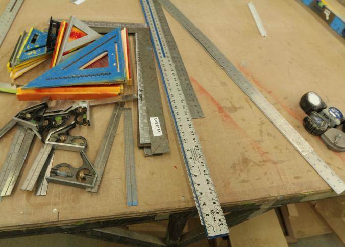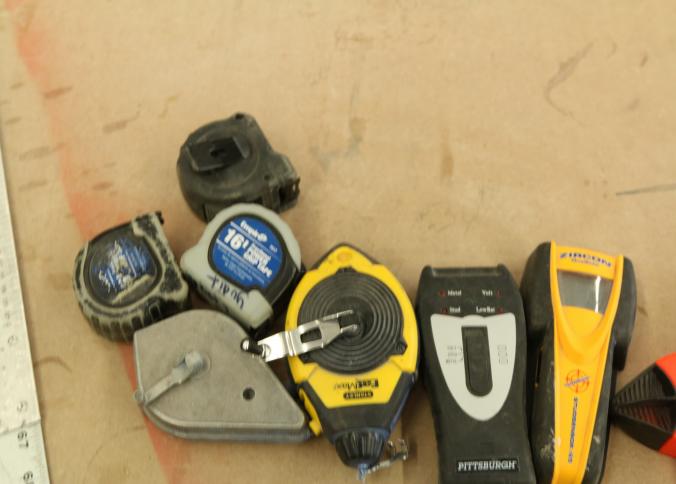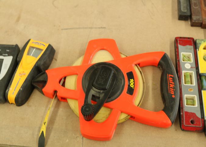 Carpentry tools, including large squares, T squares, triangle squares, sliding T squares, rulers, sliding T bevels, 78",48",24" levels, torpedo levels, chalk lines, glass scrapers with blades, box cutters with blades, razor blades, 100 foot measuring tape, box of pencils, pencil sharpeners, pens and other writing utensils, measuring tapes, and stud finders, etc. Buyer must take all. Excludes table and other lots. Pickup can be completed on both days.