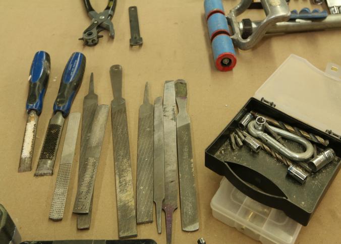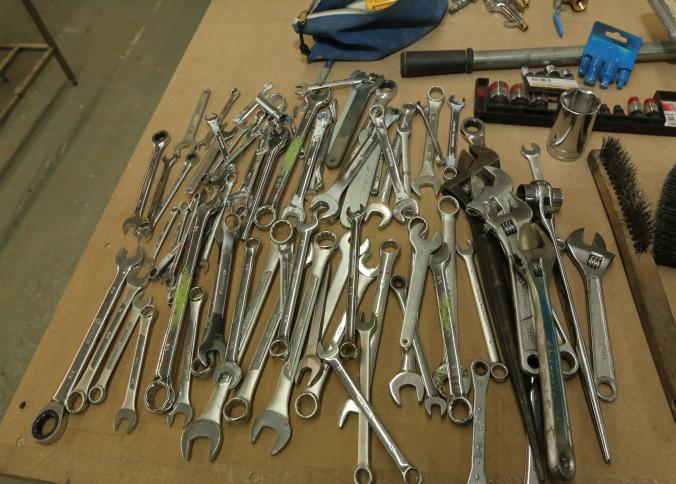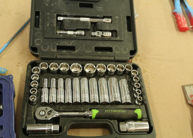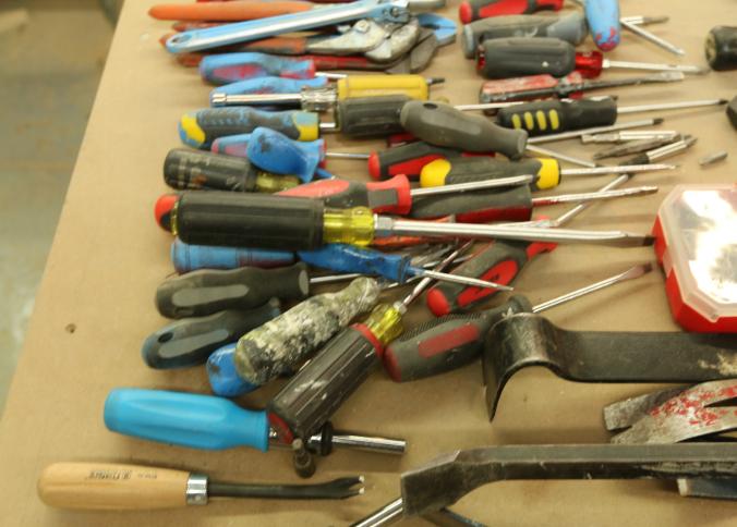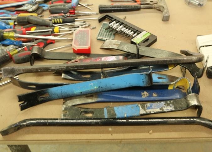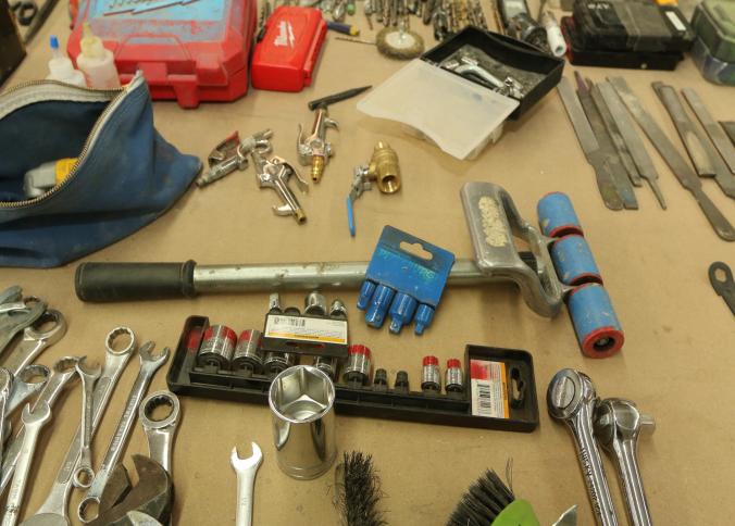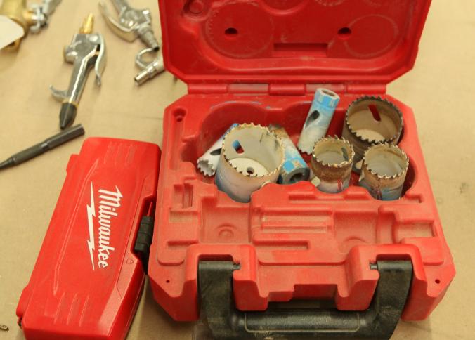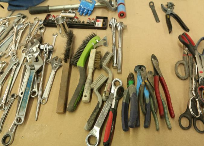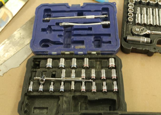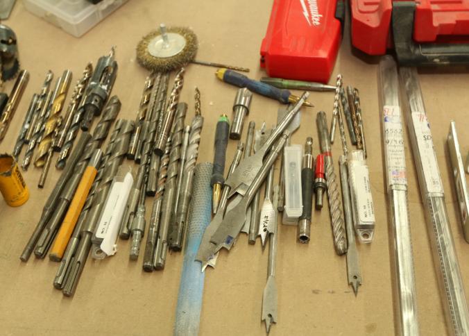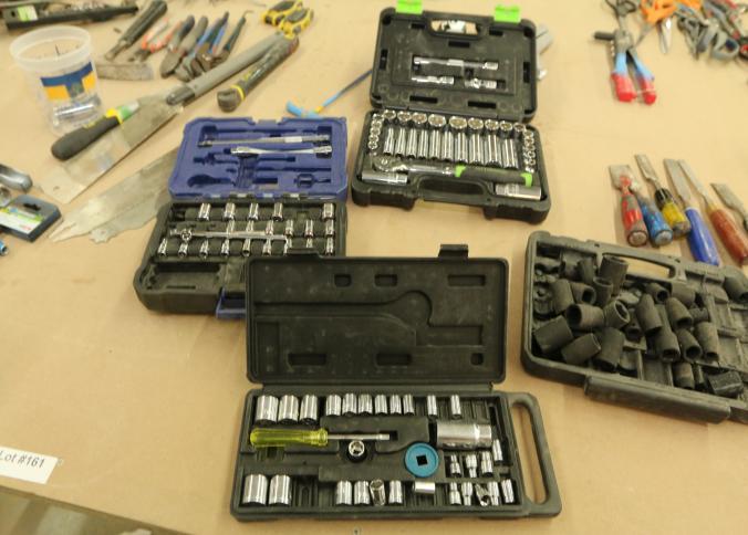 Hand tools including combination wrenches, hammers, screw drivers, hand files, flex saws, socket sets, scrapers, files, ratchet, flatbar, chisels rivet gun, wire brushes, wrenches, adjustable wrenches, hole saws, Alan (hex) key sets, pry-bars, hammer, scissors, wire cutters, drill bit set, three drawer ranging in size from approx 1/16" to approx 1/2". 1/64" intervals. Approx 8"x15"X 8"t. Buyer must take all. Excludes table. Pickup can be completed on both days.
