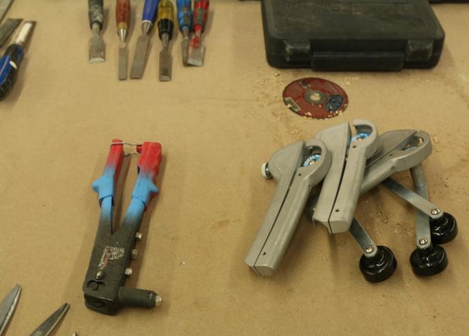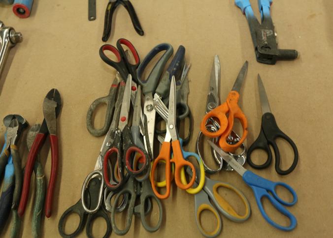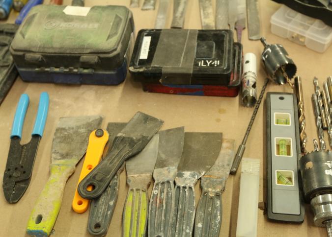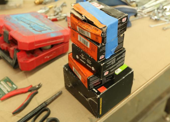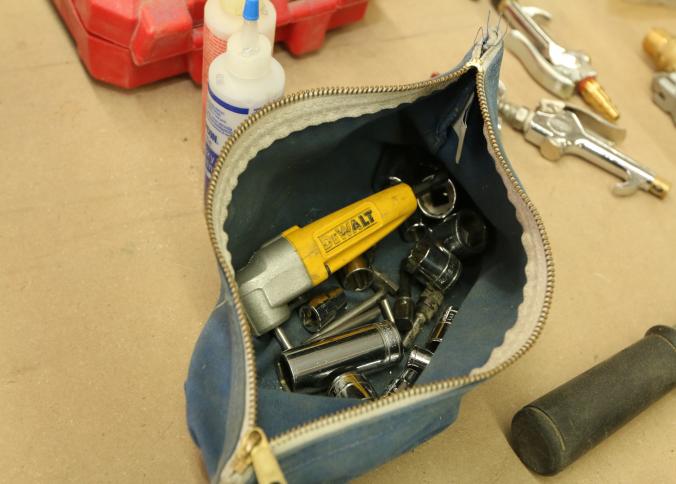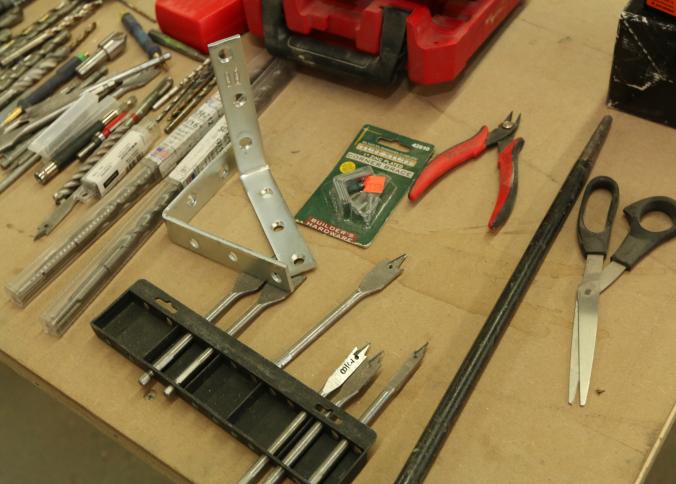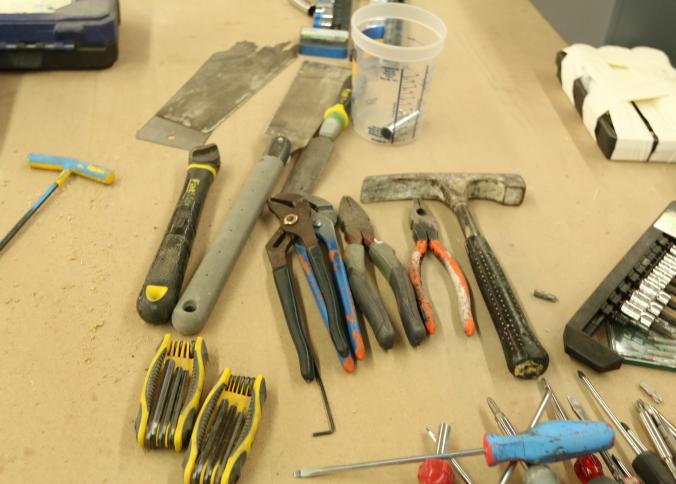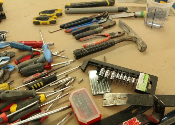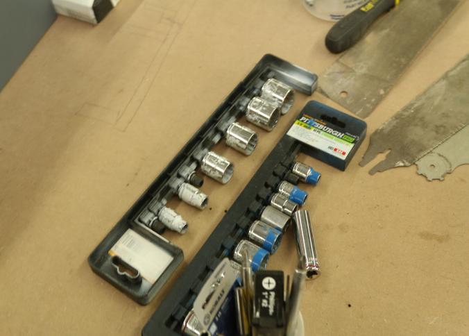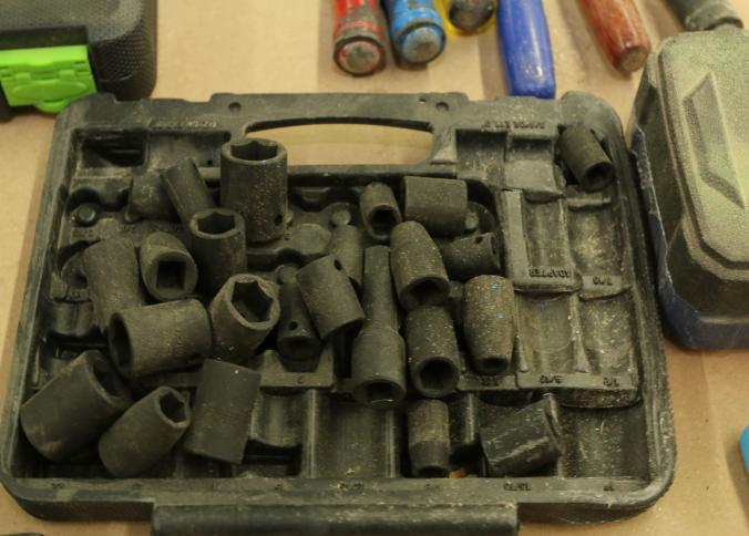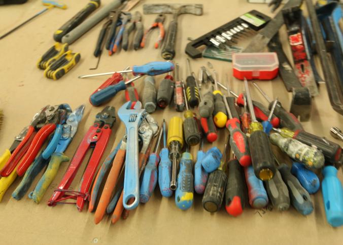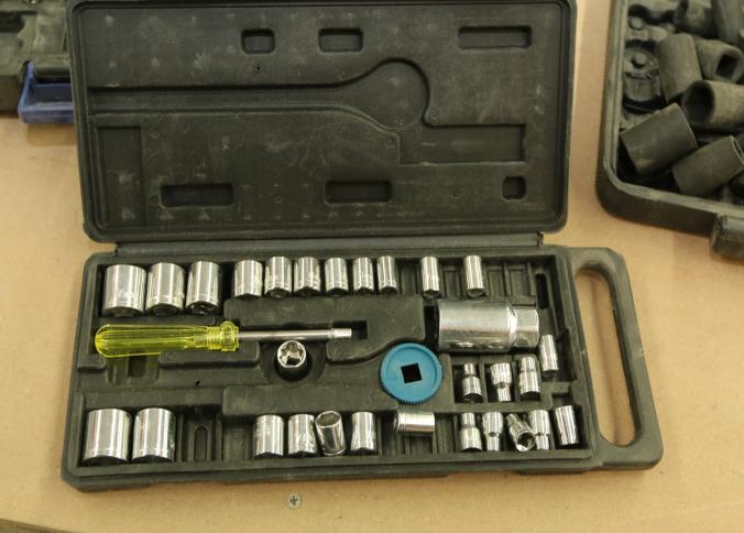 Hand tools including combination wrenches, hammers, screw drivers, hand files, flex saws, socket sets, scrapers, files, ratchet, flatbar, chisels rivet gun, wire brushes, wrenches, adjustable wrenches, hole saws, Alan (hex) key sets, pry-bars, hammer, scissors, wire cutters, drill bit set, three drawer ranging in size from approx 1/16" to approx 1/2". 1/64" intervals. Approx 8"x15"X 8"t. Buyer must take all. Excludes table. Pickup can be completed on both days.