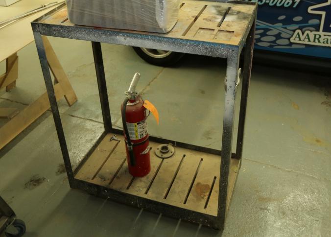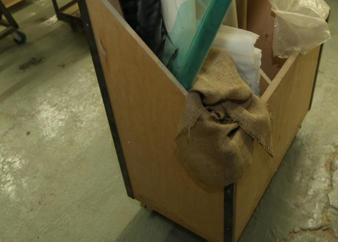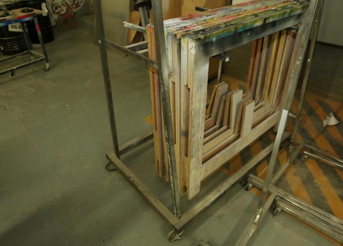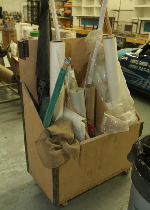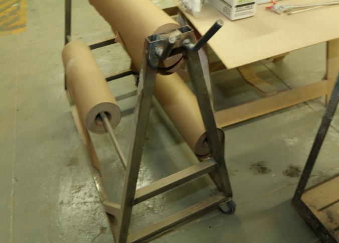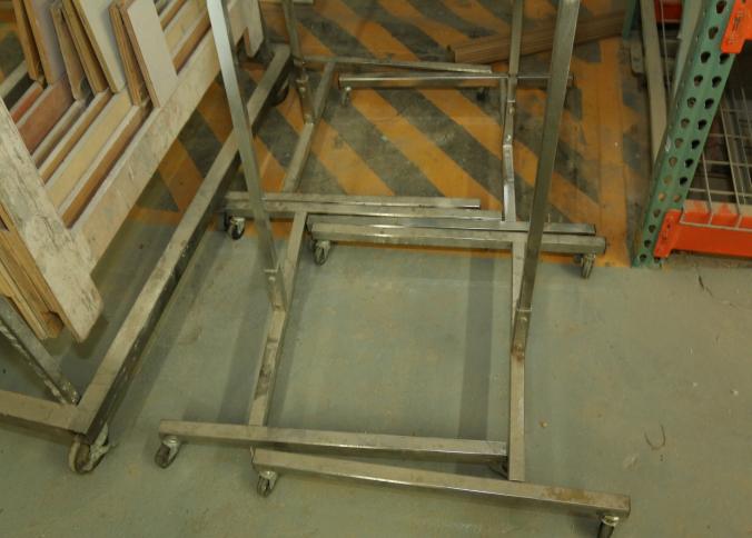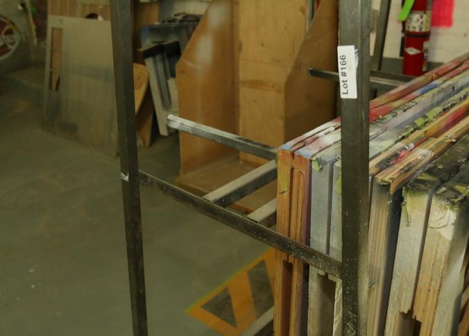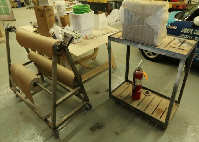 Metal Aframe rack for storage of materials and tools approx 55" x 36" x 96" tall, paper roll dispenser, metal and wood rolling work cart, and plywood rolling cart for storage of various materials. Including contents. Buyer must take all. Pickup can be completed on both days.