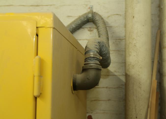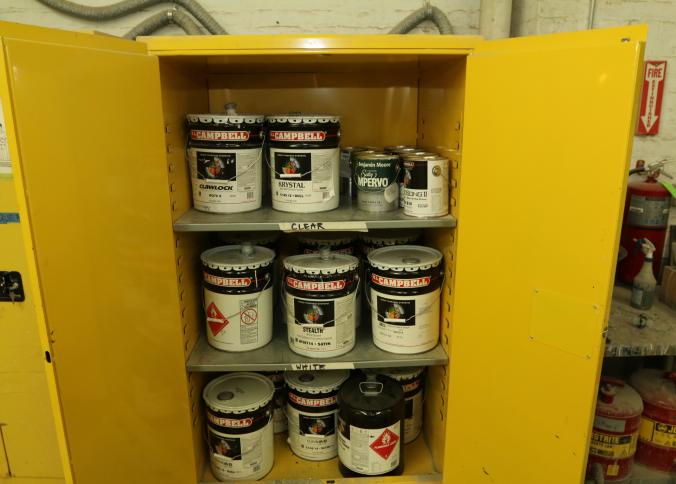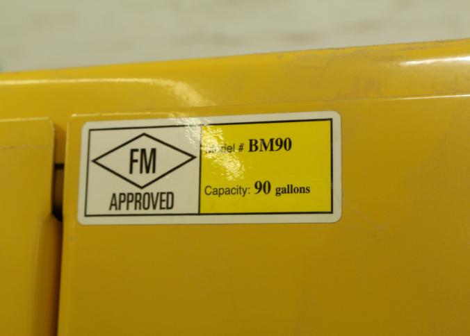 FM approved 90 gallon capacity safety storage cabinet model BM90, 43" x 35" x 65" tall. Also includes contents. Buyer must take all. Pickup can be completed on both days.
