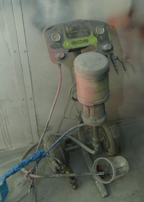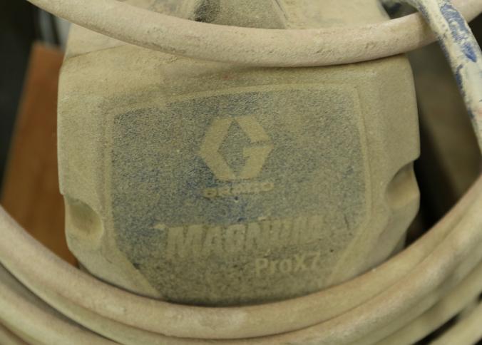 Three paint sprayers including two Kremlin Rexson EOS Pompe, Graco Magnum ProX7, portable compressed air container, and air hose. Buyer must take all. Pickup can be completed on both days.