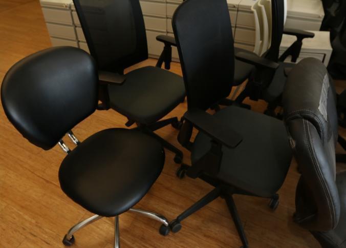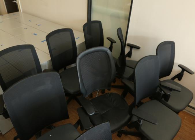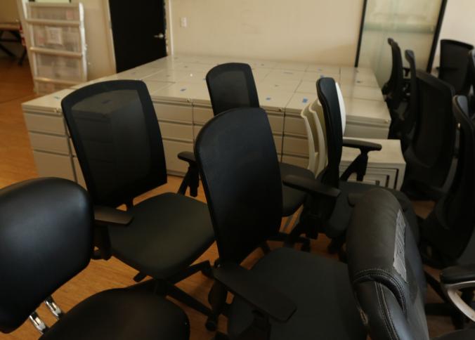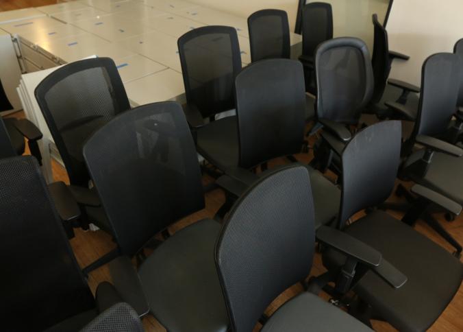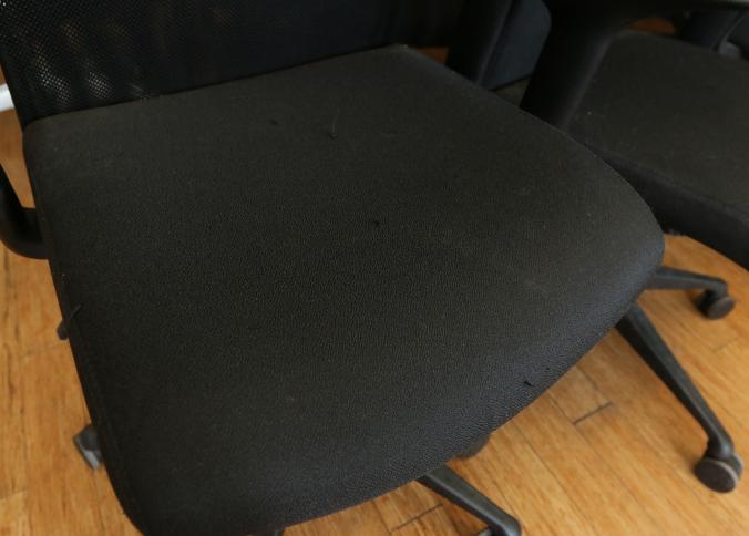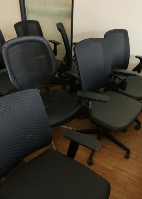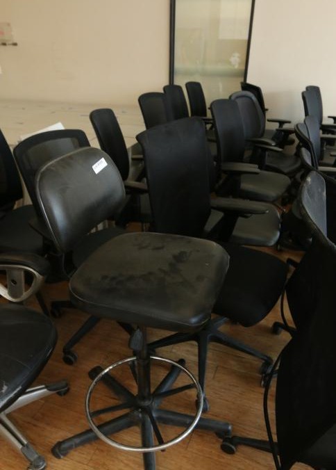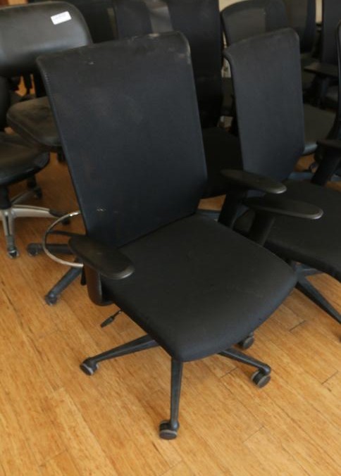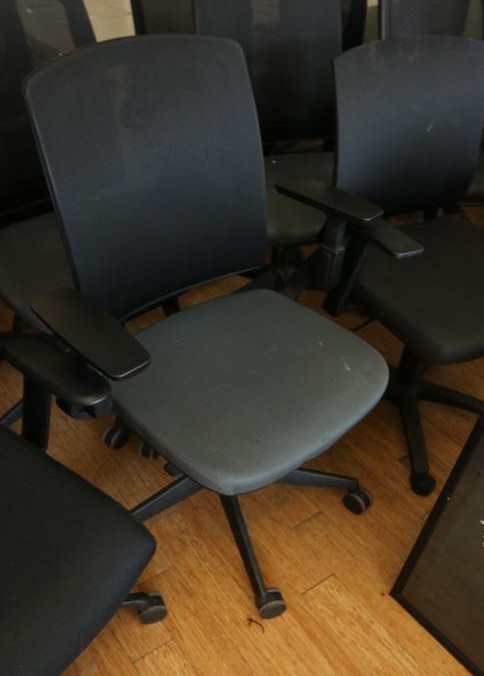 23 black office chairs upholstered, some with mesh backs and on caster. Largest measuring approx 25"x24"x47"t. Buyer must take all. Pickup can be completed on both days.