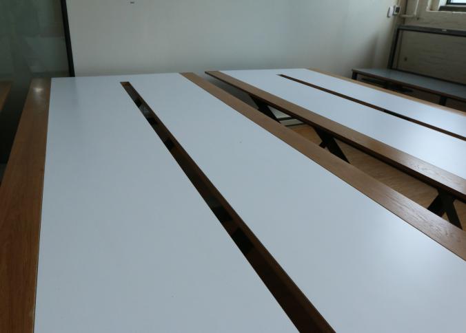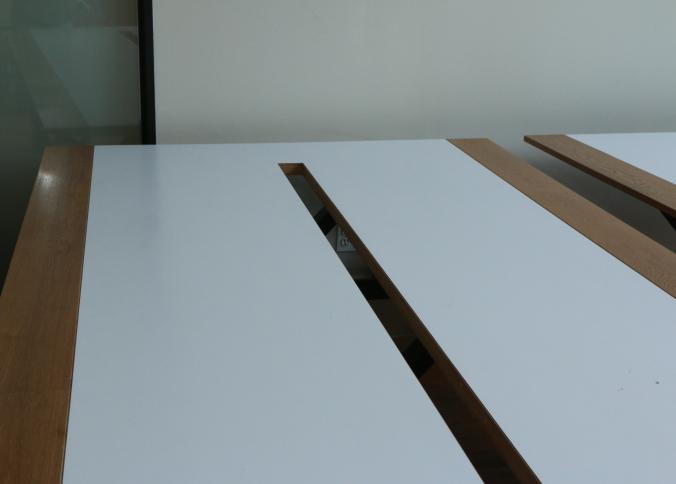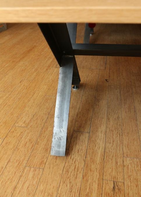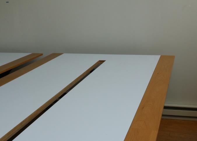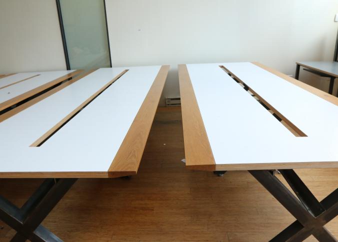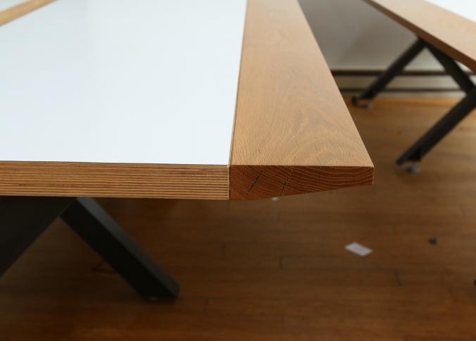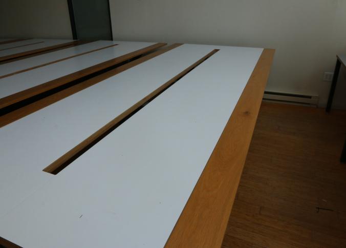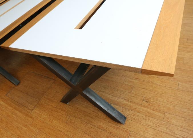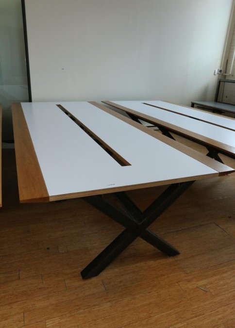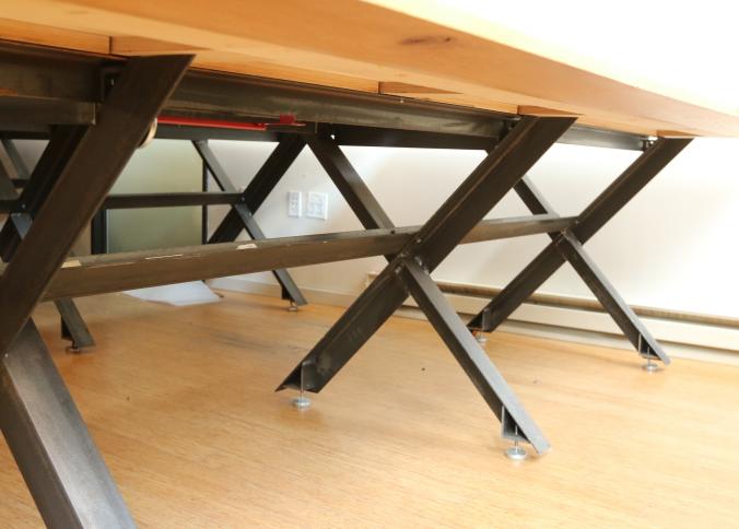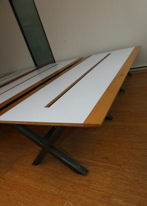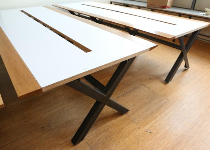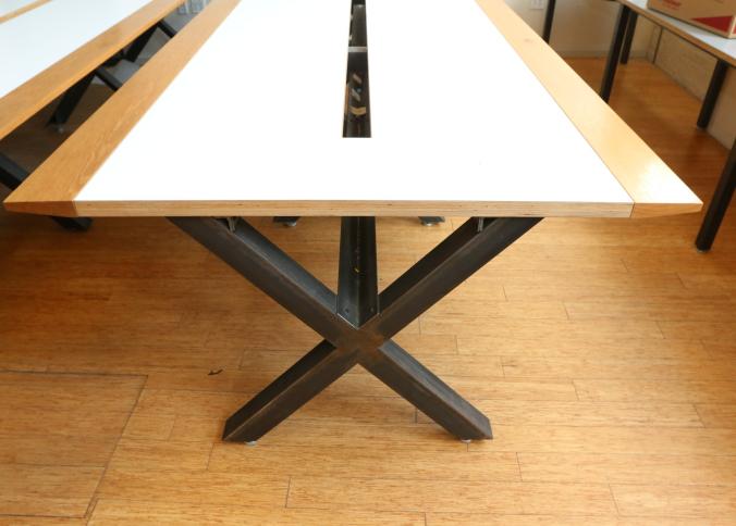 Two Handmade custom metal frame wood top Formica lined tables with wire access through center measuring approx 59"x141"x32"t. Pickup can be completed on both days.