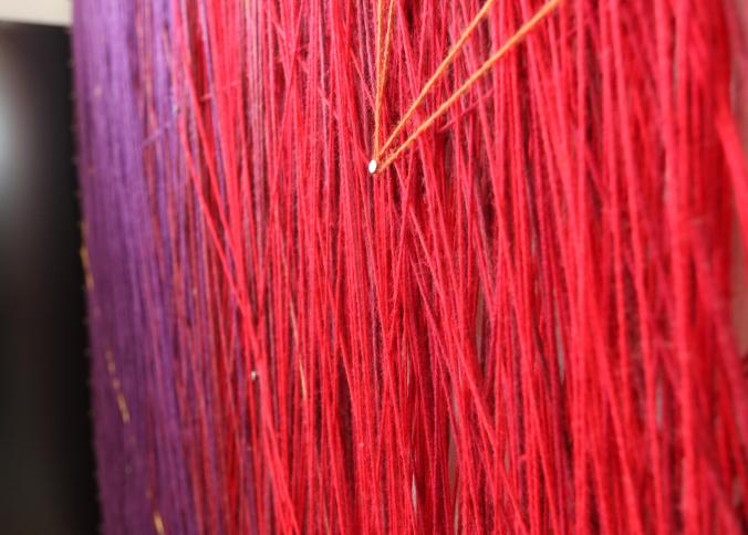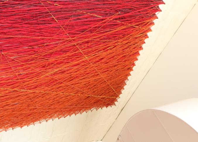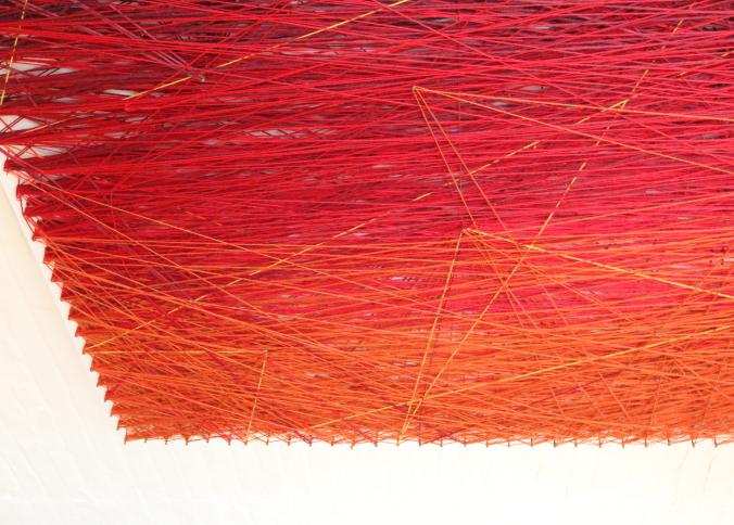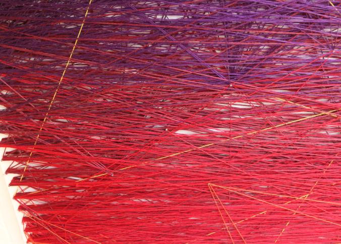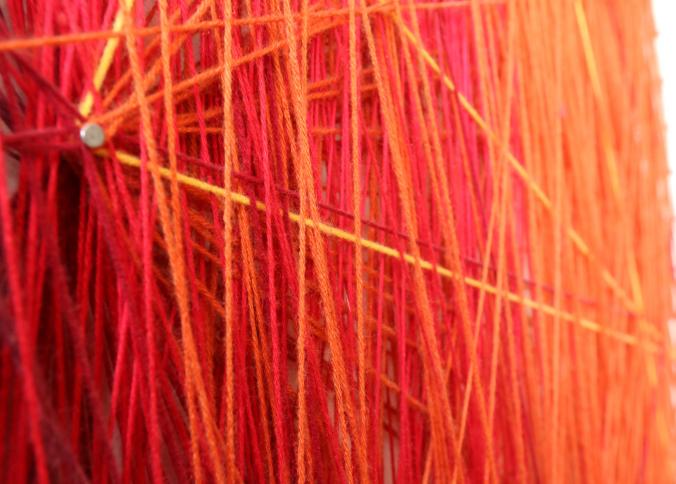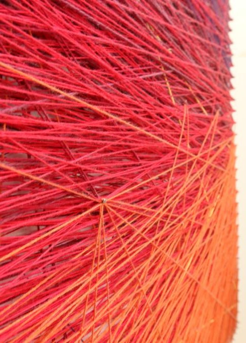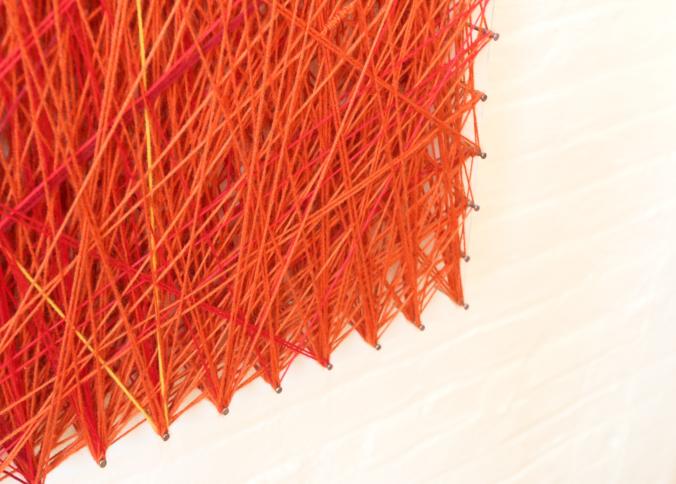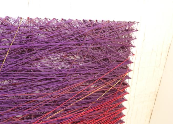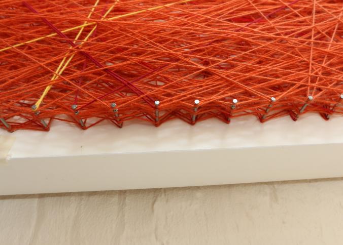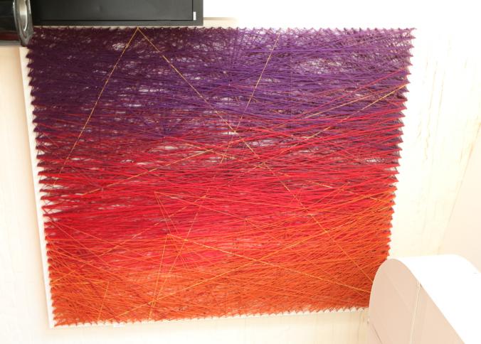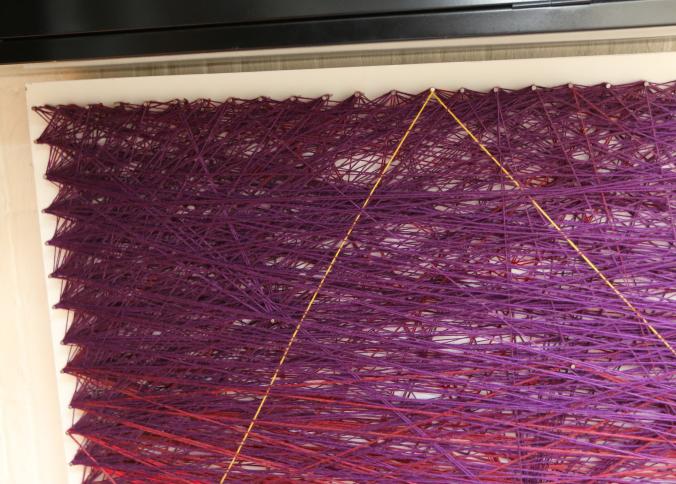 Wall art consisting of colored string wrapped around nails measuring approx 96"x78", unsigned. Pickup can be completed on both days.