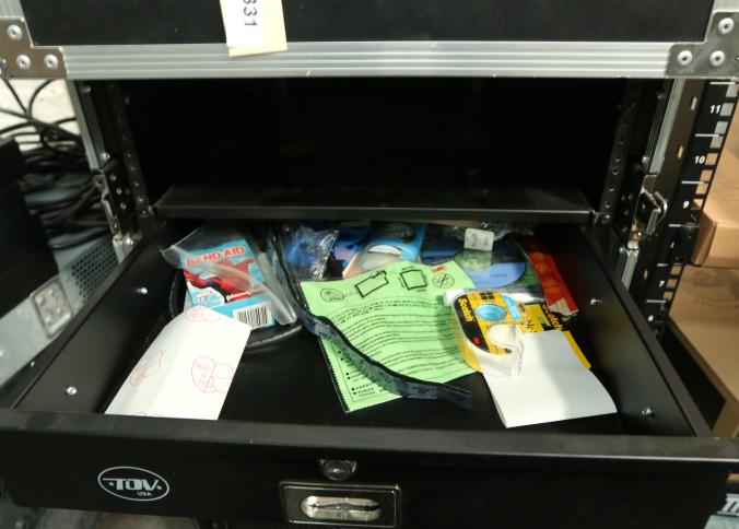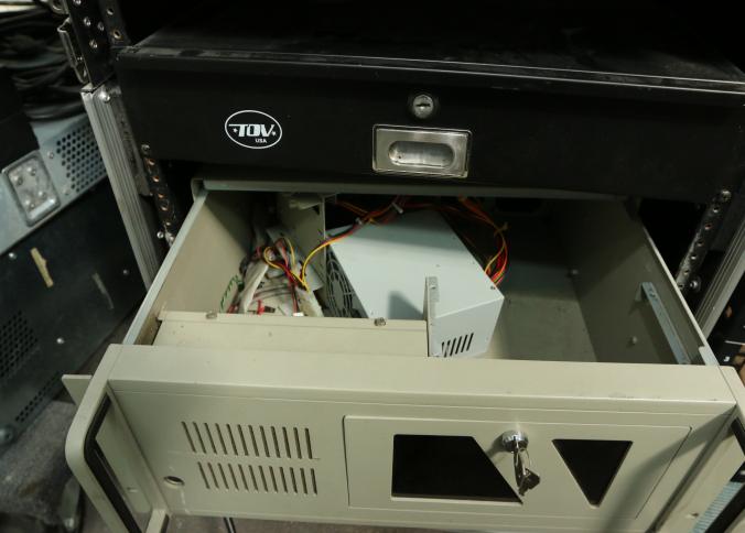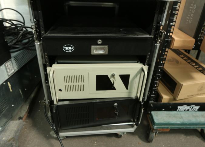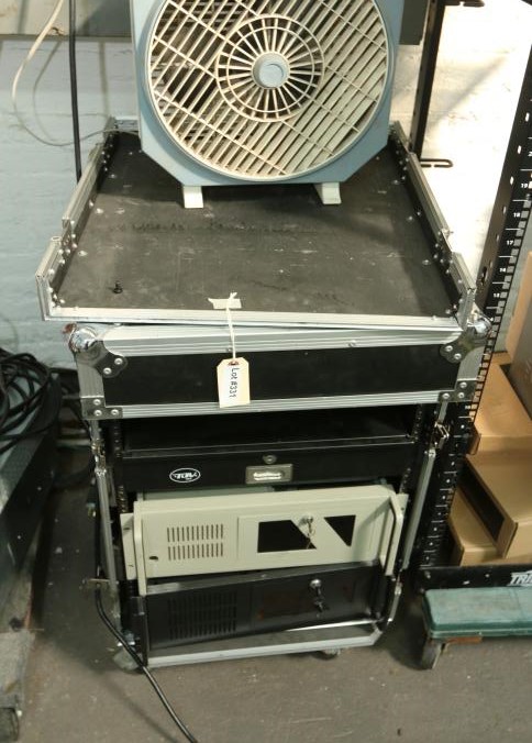 Mini server tower rack with various parts components for battery backups, rack approx 22" x 25" x 36" tall on casters. Pickup can be completed on both days.