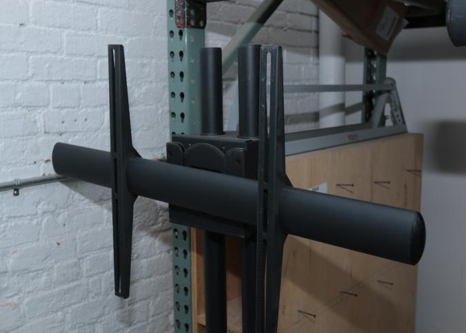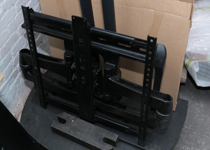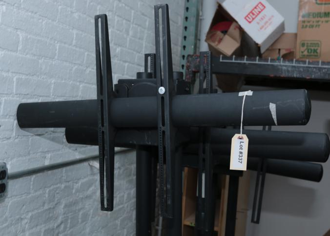 Four Metal adjustable freestanding pedestal flat screen TV stands, tallest being approx 84" tall. Pickup can be completed on both days.