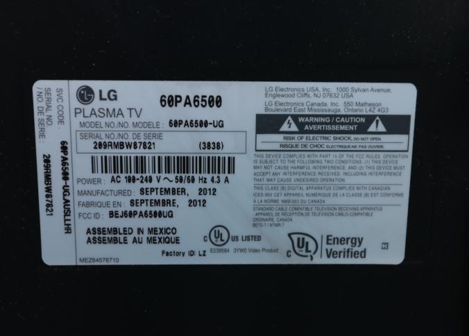 Lg 60" plasma TV model 60PA6500. Pickup can be completed on both days.