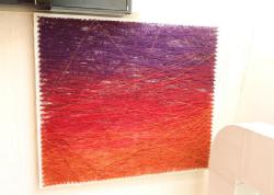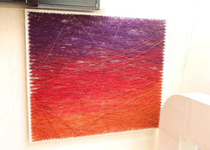 Wall art consisting of colored string wrapped around nails measuring approx 96"x78", unsigned. Pickup can be completed on both days.