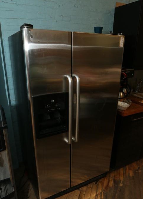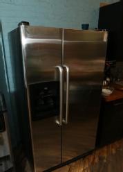 Stainless steel face Whirlpool standup refrigerator freezer combo model ID2HHEXTS01 serial HRW1628629 with external ice and water dispenser. Measures approx 33"x33"x67"t. Pickup must be completed on Thursday, September 8 by 3PM.