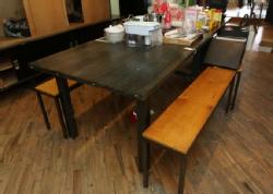 Dining set including steel construction finished wood top table measuring approx 46"x152"x34"t, and four wood top bench style steel construction seats measuring 13"x59"x21"t. Pickup must be completed on Friday, September 9 by 3PM.