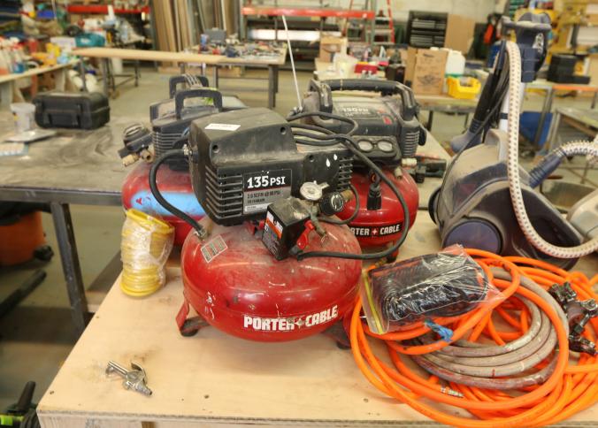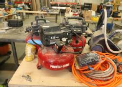3 Porter Cable pancake air compressors incl 135PSI 6 gallon model CF2600, and two 150PSI 6 Gal model C2002. Also including four air hoses. Pickup can be completed on both days.