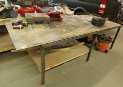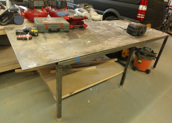 Steel work table with 1/2" thick top, and box beam frame. 48" x 121" x 36" tall. Excluding other lots. Pickup can be completed on both days.