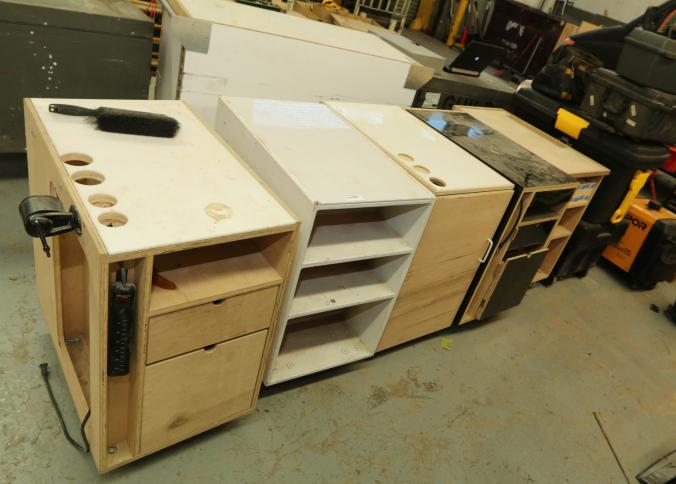 Various storage boxes and rolling carts, each box approx 20" x 30" x 33" tall, on casters. Both carts with storage compartments 25" x 58" x 39" tall. Pickup can be completed on both days.