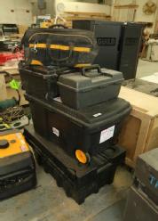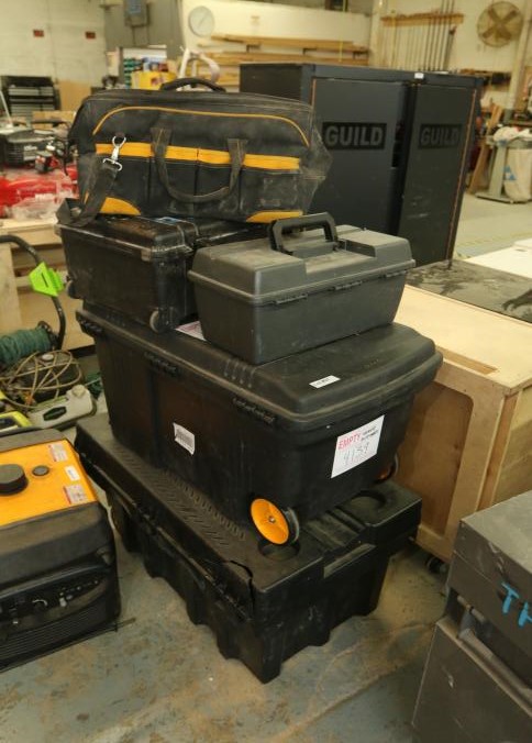 Job boxes, travel cases, tool box, and tool bag. Largest approx 24" x 38" x 19" tall. Five pieces total. Pickup can be completed on both days.