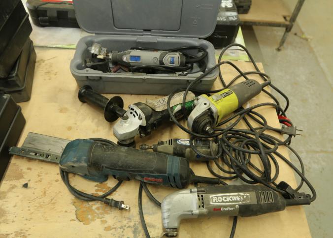 Dremel model 4200 with remote line attachment, sanders, shear, & saw attachment, and model 395, Rockwell modelR5102K sonicrafter vibrating saw, Bosch model 1640VS fine cut reciprocating saw, Hitachi model G12SR3 grinder, Ryobi model AG4031G grinder. Ingersoll Rand model 529 pneumatic reciprocating saw. Pickup can be completed on both days.