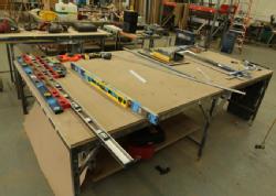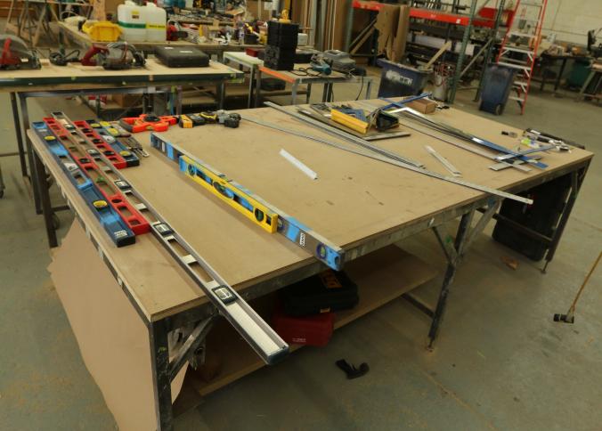 Carpentry tools, including large squares, T squares, triangle squares, sliding T squares, rulers, sliding T bevels, 78",48",24" levels, torpedo levels, chalk lines, glass scrapers with blades, box cutters with blades, razor blades, 100 foot measuring tape, box of pencils, pencil sharpeners, pens and other writing utensils, measuring tapes, and stud finders, etc. Buyer must take all. Excludes table and other lots. Pickup can be completed on both days.
