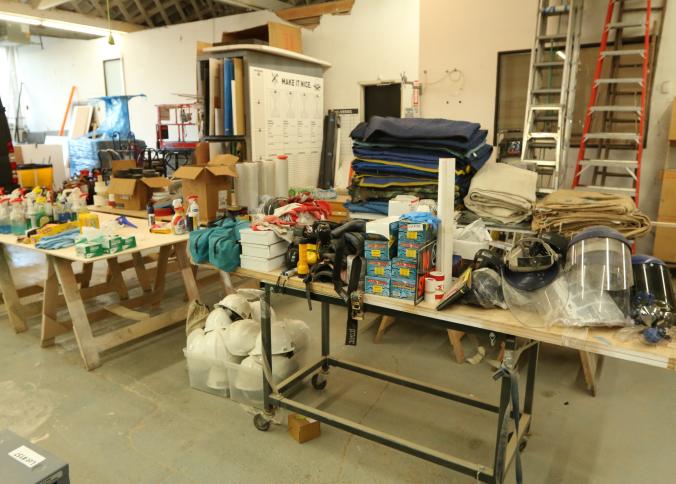 Table lot of protective face masks, some with respirators and extra filters, boxes of nitrile gloves, hearing protection, work gloves, helmet, 12+ hard-hats, knee pads, safety harnesses, safety related stickers, flashlight, exit signs, five first aid kits, and more. Buyer must take all. Excludes tables. Pickup must be completed Thursday, September 8 by 3PM.