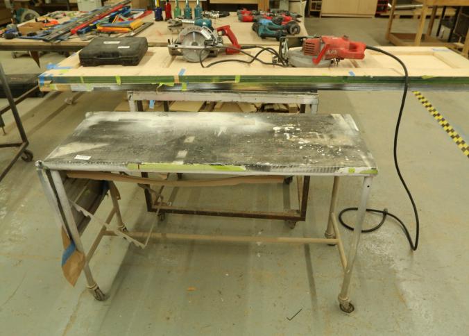 Five rolling work benches including 20" x 55" x 33" tall, two approx 24" x 40" x 35" tall. Buyer must take all. Excluding contents and other lots. Pickup can be completed on both days.