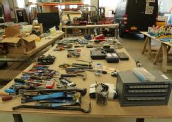 Hand tools including combination wrenches, hammers, screw drivers, hand files, flex saws, socket sets, scrapers, files, ratchet, flatbar, chisels rivet gun, wire brushes, wrenches, adjustable wrenches, hole saws, Alan (hex) key sets, pry-bars, hammer, scissors, wire cutters, drill bit set, three drawer ranging in size from approx 1/16" to approx 1/2". 1/64" intervals. Approx 8"x15"X 8"t. Buyer must take all. Excludes table. Pickup can be completed on both days.