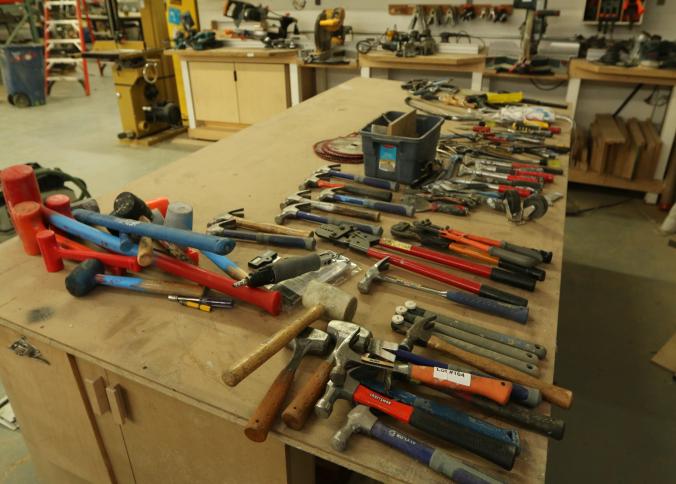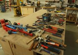 Contents of the table including dead blow hammers, mallets, hammers, sledgehammers, bolt cutters, spackling tools, scrapers, wrenches, saw blades, snips, reciprocating sculpting saws, key-hole saws, c-clamps, hand saws, vice grips, etc. Pickup must be completed Thursday, September 8 by 3PM.